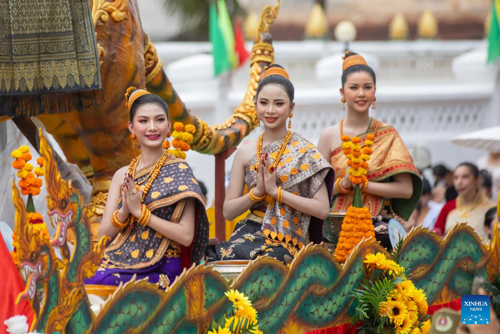 Miss Songkran parade is held during the Songkran Festival in Luang Prabang, Laos, April 16, 2025. Laos celebrates the Songkran Festival, or the Lao New Year from April 14 to 16 this year. A series of celebrations are held to celebrate this traditional festival. (Photo by Kaikeo Saiyasane/Xinhua)