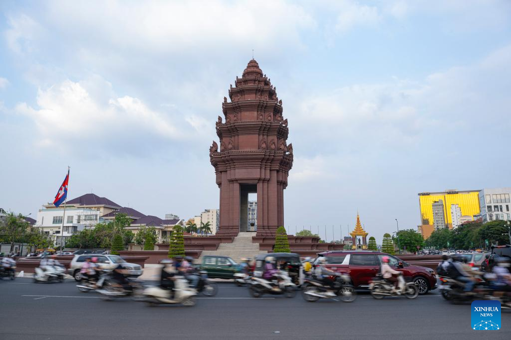 This photo taken on March 14, 2025 shows the Independence Monument in Phnom Penh, Cambodia. Phnom Penh, capital of the Kingdom of Cambodia, is located beside the confluence of the Mekong and Tonle Sap rivers. The coexistence of traditional architecture and modern buildings endows the city with life and vitality. (Xinhua/Cheong Kam Ka)