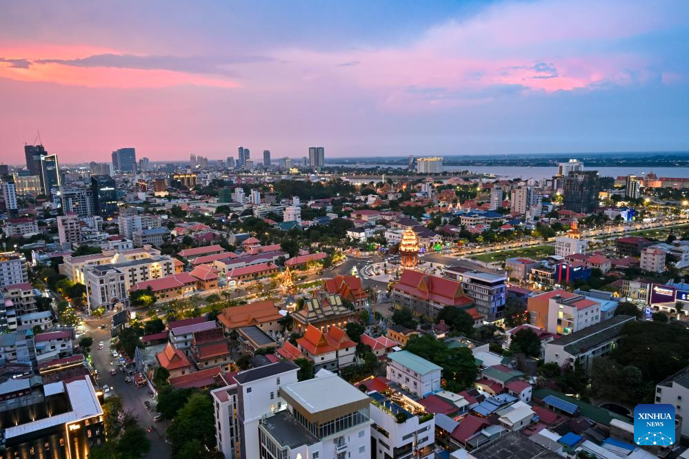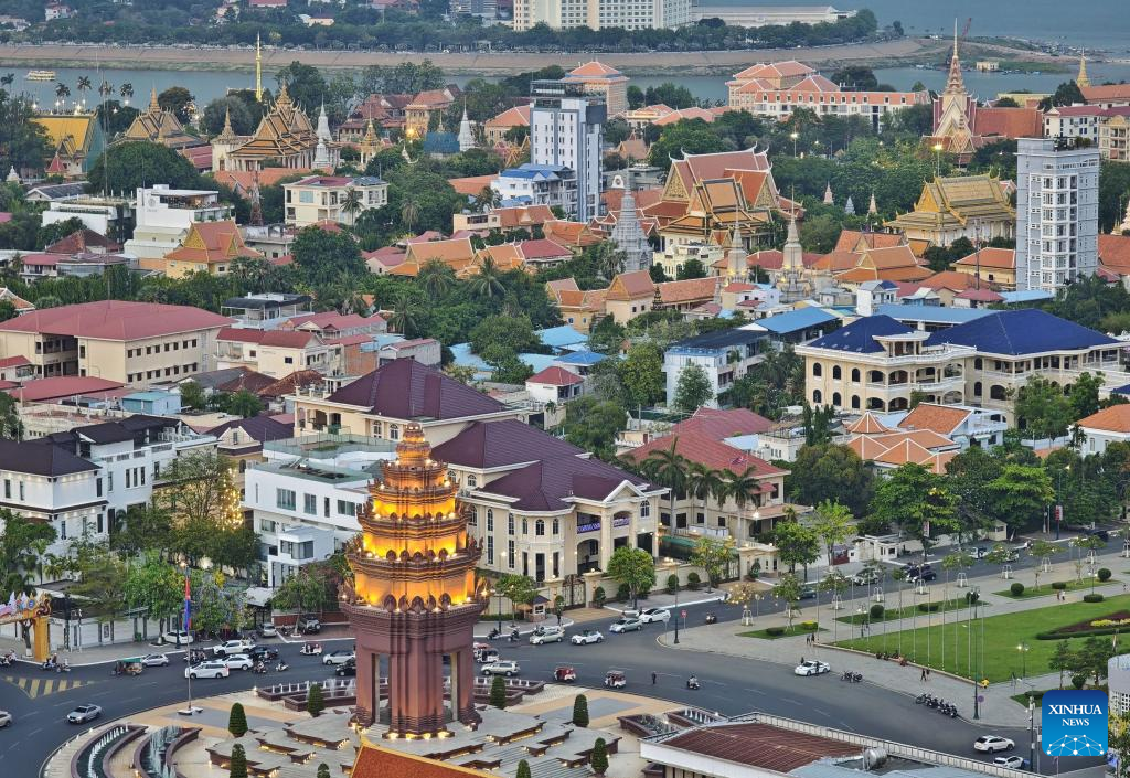 This photo taken on April 13, 2025 shows the cityscape of Phnom Penh, Cambodia. Phnom Penh, capital of the Kingdom of Cambodia, is located beside the confluence of the Mekong and Tonle Sap rivers. The coexistence of traditional architecture and modern buildings endows the city with life and vitality. (Xinhua/Zhang Cheng)