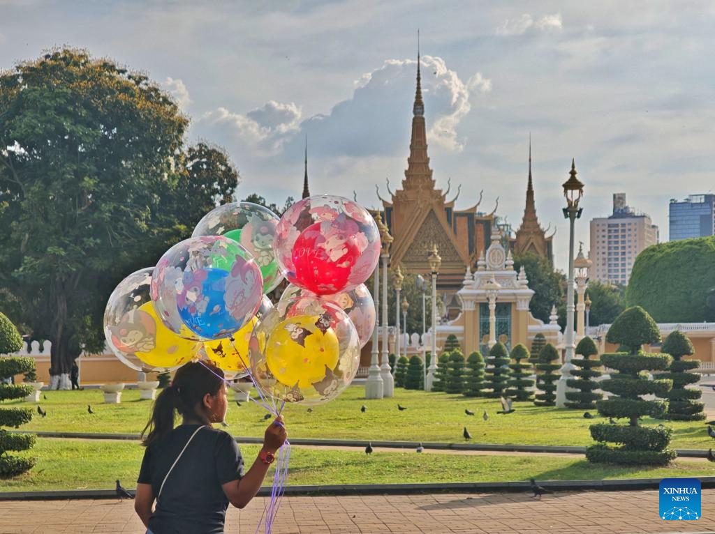 This photo taken on April 14, 2025 shows the square outside the Royal Palace in Phnom Penh, Cambodia. Phnom Penh, capital of the Kingdom of Cambodia, is located beside the confluence of the Mekong and Tonle Sap rivers. The coexistence of traditional architecture and modern buildings endows the city with life and vitality. (Xinhua/Wang Ye)
