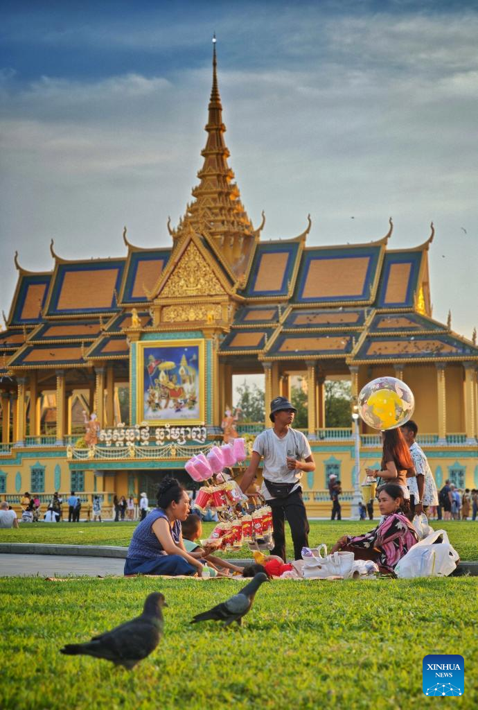 People relax at the square outside the Royal Palace in Phnom Penh, Cambodia, April 14, 2025. Phnom Penh, capital of the Kingdom of Cambodia, is located beside the confluence of the Mekong and Tonle Sap rivers. The coexistence of traditional architecture and modern buildings endows the city with life and vitality. (Xinhua/Wang Ye)