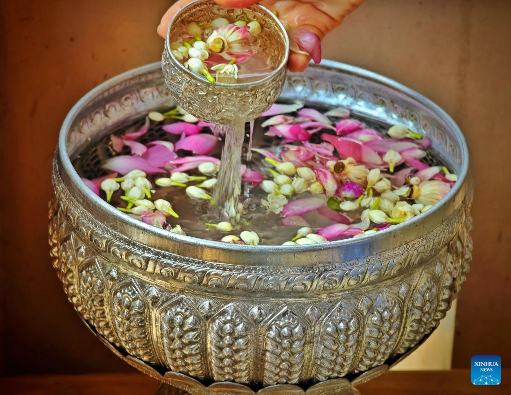 People take part in a blessing activity to celebrate the Cambodian New Year in Phnom Penh, Cambodia, April 14, 2025. Phnom Penh, capital of the Kingdom of Cambodia, is located beside the confluence of the Mekong and Tonle Sap rivers. The coexistence of traditional architecture and modern buildings endows the city with life and vitality. (Xinhua/Wang Ye)