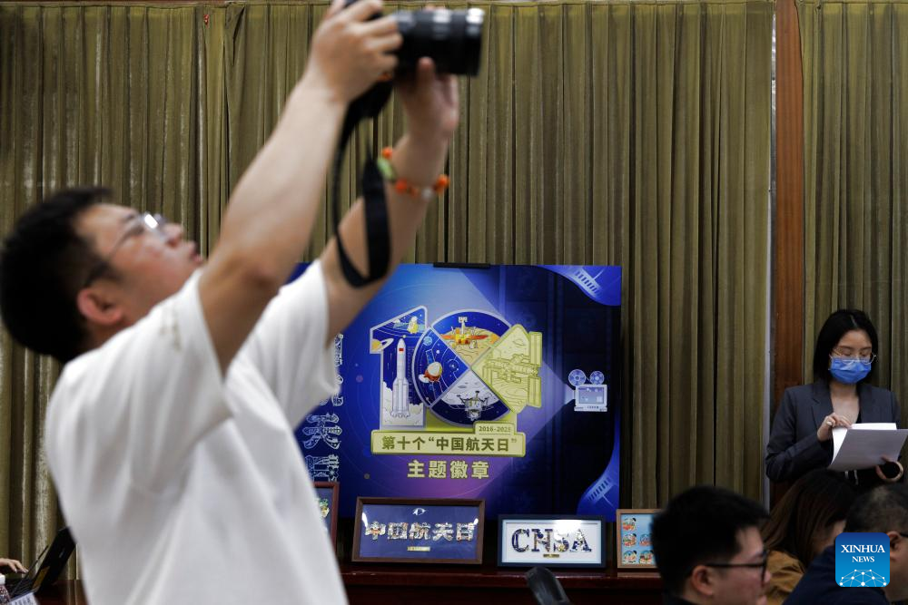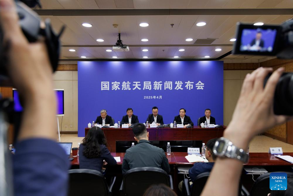 The China National Space Administration (CNSA) holds a press conference on the upcoming 10th Space Day of China in Beijing, capital of China, April 17, 2025. The 10th Space Day of China is to be held on April 24 in Shanghai and it will include the opening ceremony, space science exhibitions, cultural forums, and academic conferences, according to Liu Yunfeng, deputy director of the CNSA's system engineering department, at the press conference. (Xinhua/Jin Liwang)