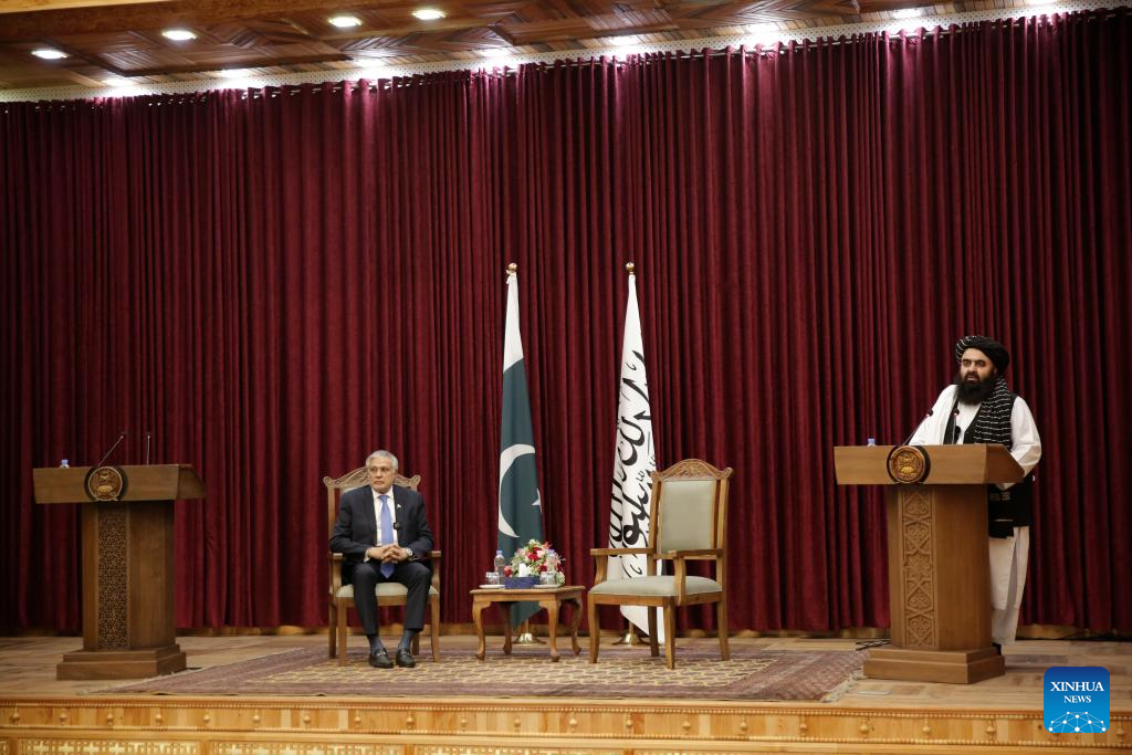 KABUL, April 19 (Xinhua) -- Afghan interim government's Acting Minister for Foreign Affairs Mawlawi Amir Khan Muttaqi held talks with Pakistani Deputy Prime Minister and Foreign Minister Mohammad Ishaq Dar in Kabul on Saturday, the ministry said in a statement.