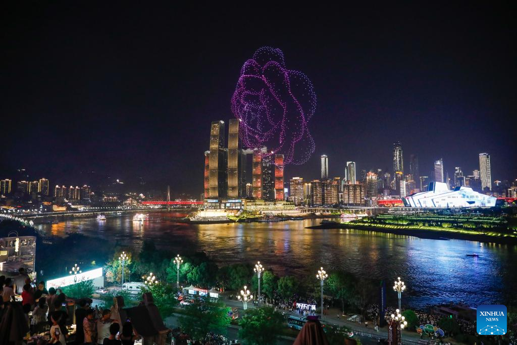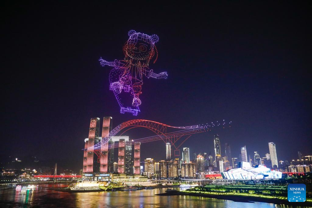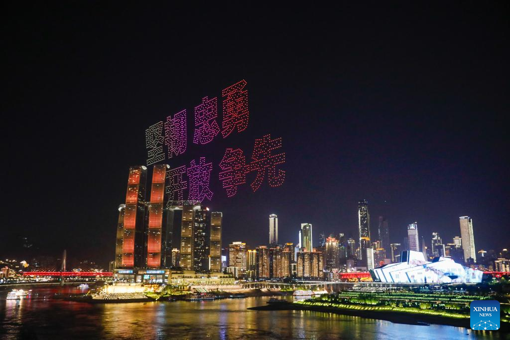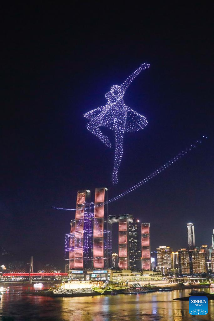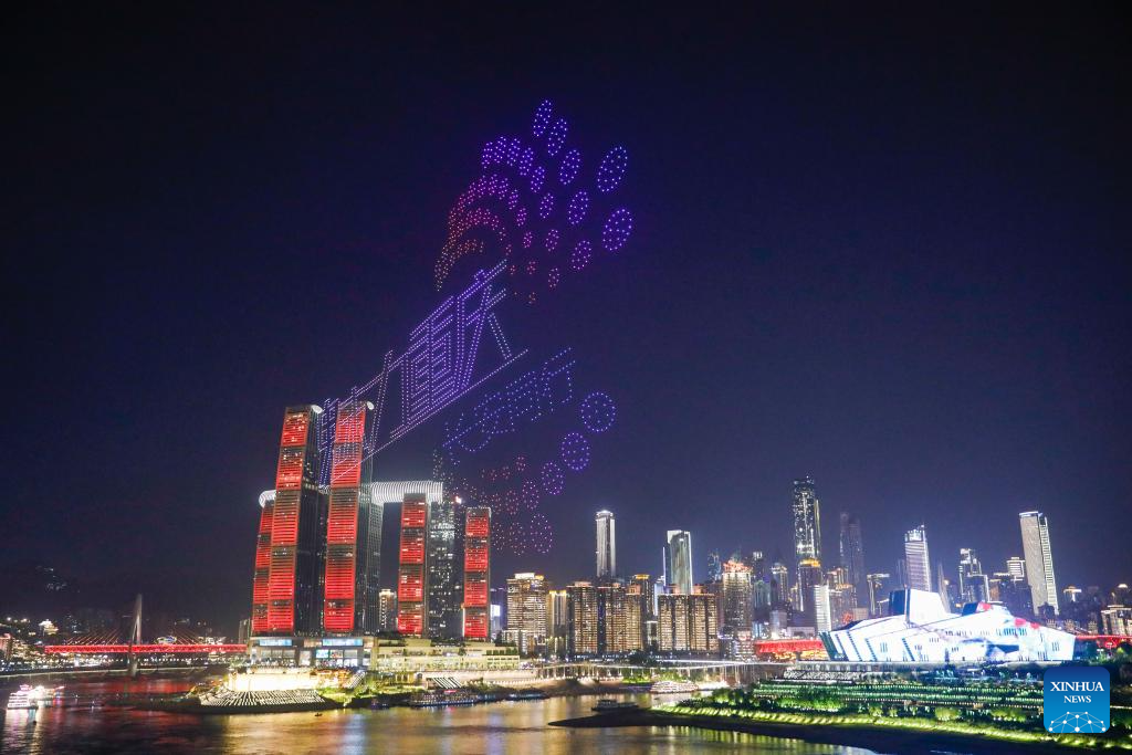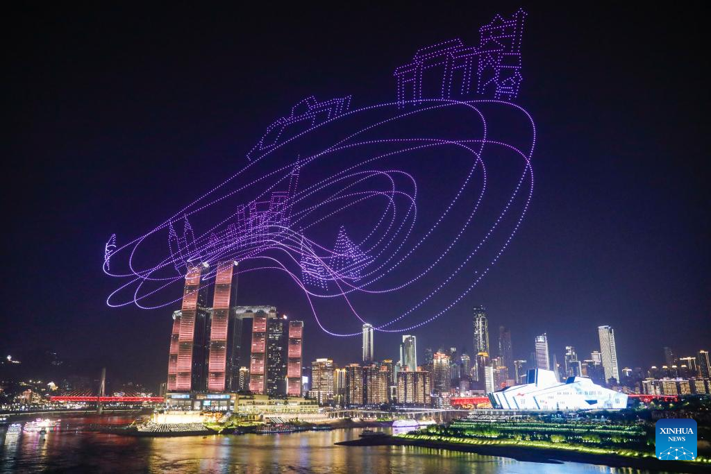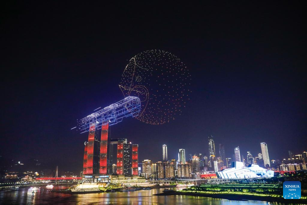 A drone light show is pictured in Nan'an District of southwest China's Chongqing Municipality, April 19, 2025. The 15-minute drone light show, which features iconic city landmarks of Chongqing, made its debut on Saturday, presenting a visual feast along with a city lighting display.