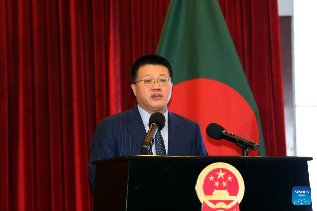 Chinese Ambassador to Bangladesh Yao Wen delivers a speech during the inauguration ceremony in Dhaka, Bangladesh, April 23, 2025. (Photo by Habibur Rahman/Xinhua)