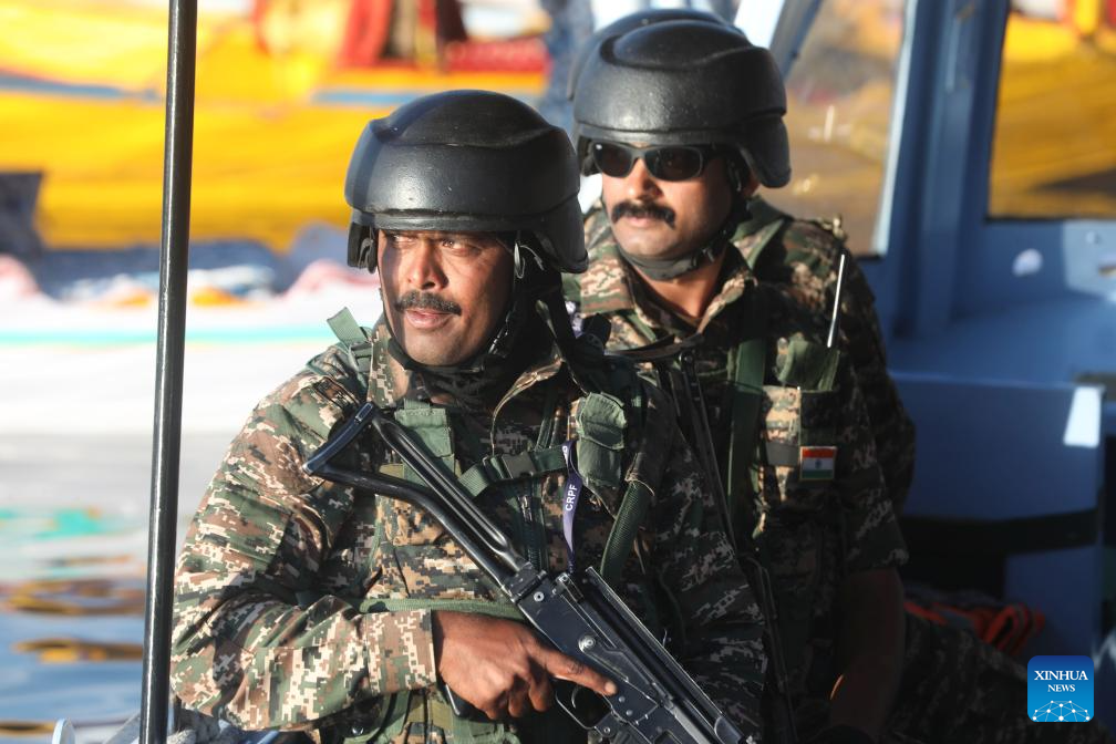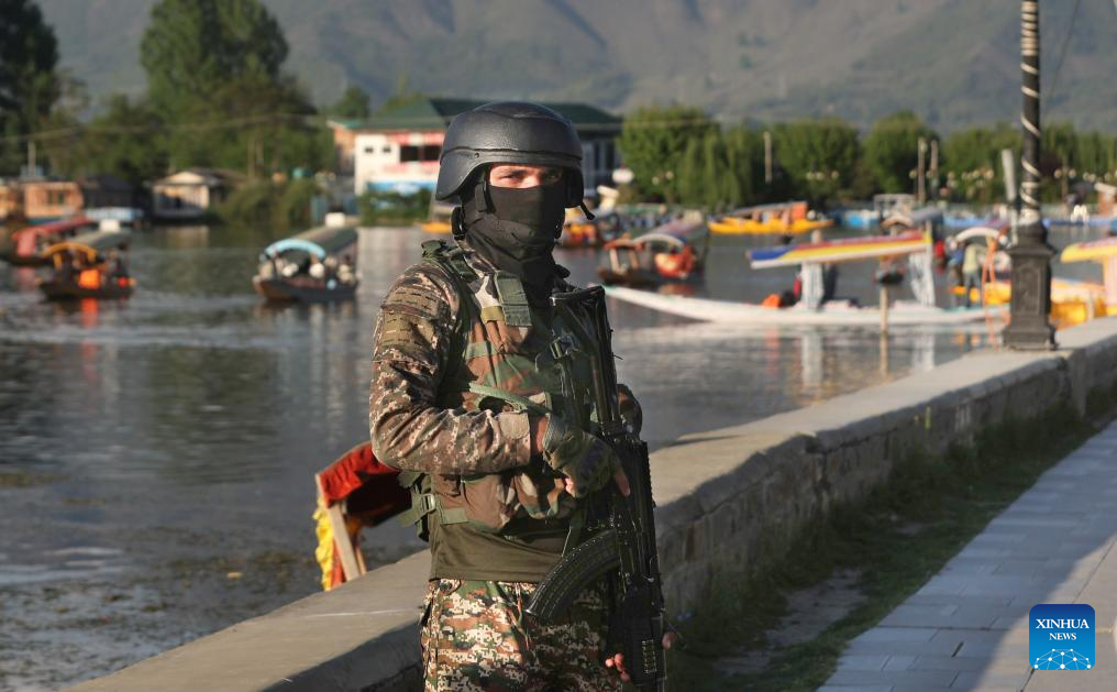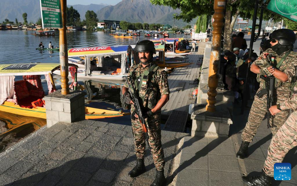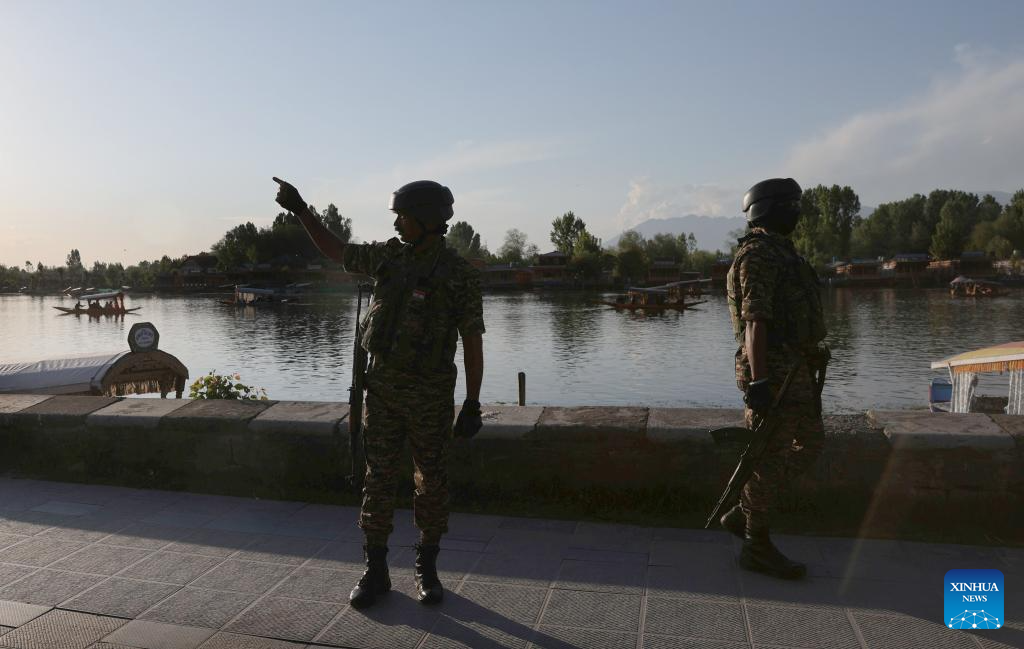 Indian paramilitary troopers stand guard after a recent attack on tourists by gunmen, in Srinagar city, the summer capital of Indian-controlled Kashmir, on April 25, 2025. The Senate of Pakistan on Friday unanimously passed a resolution, rejecting "Indian allegations" of linking Pakistan to a recent attack in Indian-controlled Kashmir. (Str/Xinhua)