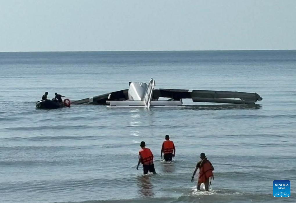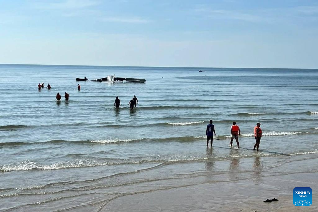 A police plane is seen crashing into the sea off Cha-am District, Phetchaburi Province, Thailand, April 25, 2025. The plane crashed near the shore of Thailand's resort town of Hua Hin on Friday morning, killing six people, the Thai police said. The police said the accident took place when the plane was conducting a test flight for parachute training. (Xinhua)