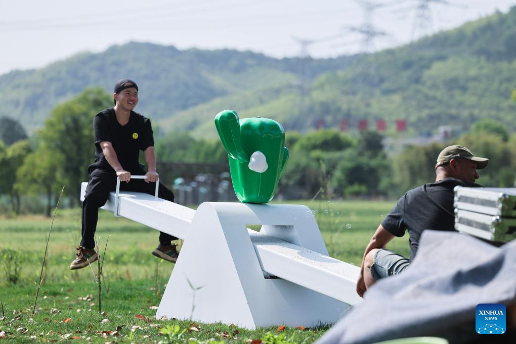 Staff members experience an art work in the shape of a seesaw in the fields in Donglin Town, Huzhou City of east China's Zhejiang Province, on April 25, 2025. A land art event kicked off in the wheat fields in Donglin Town on Friday. Teachers and students from many Chinese fine arts academies formed the core creative team, producing 42 land art pieces here.