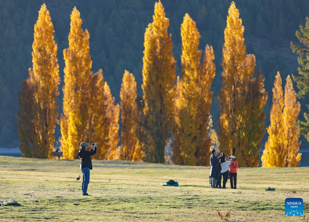 People enjoy the autumn scenery near Lake Tekapo of New Zealand's South Island, on April 26, 2025. (Xinhua/Long Lei)