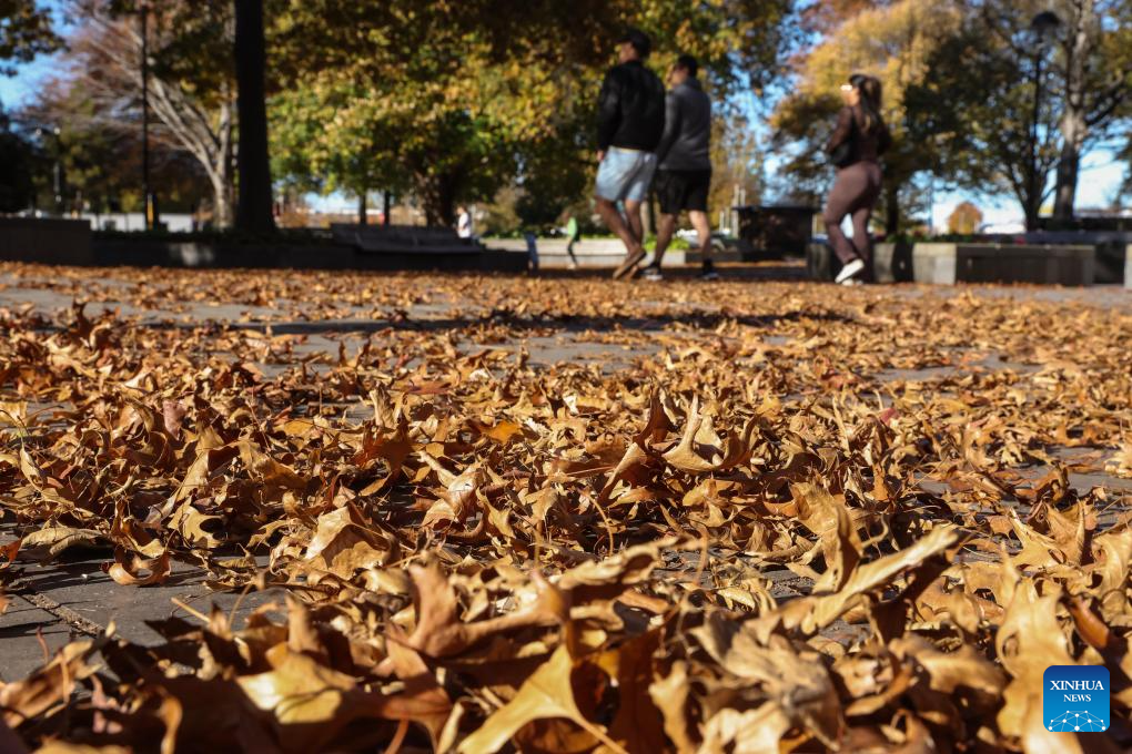 People walk on fallen leaves in Christchurch, New Zealand, on April 27, 2025. (Xinhua/Long Lei)