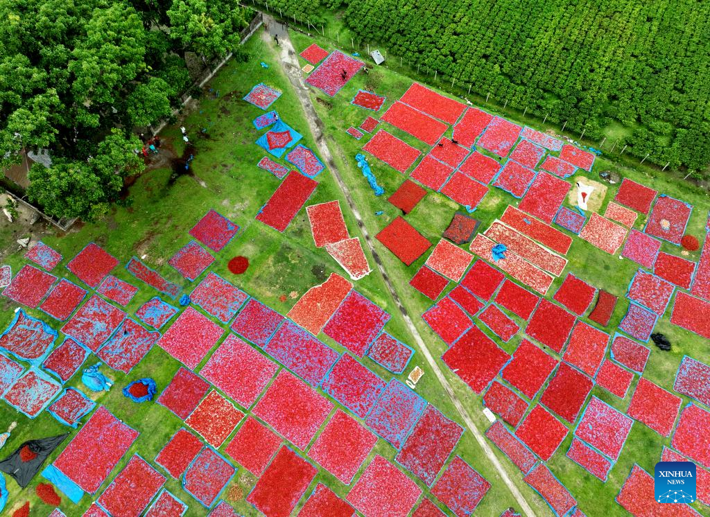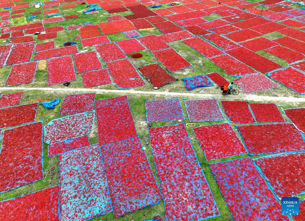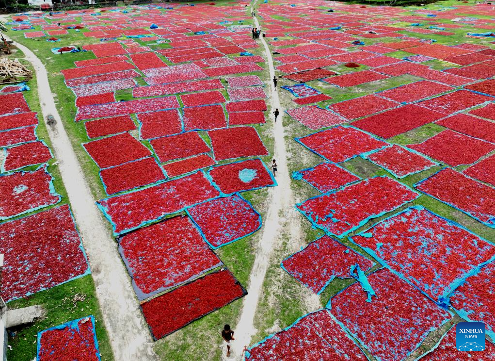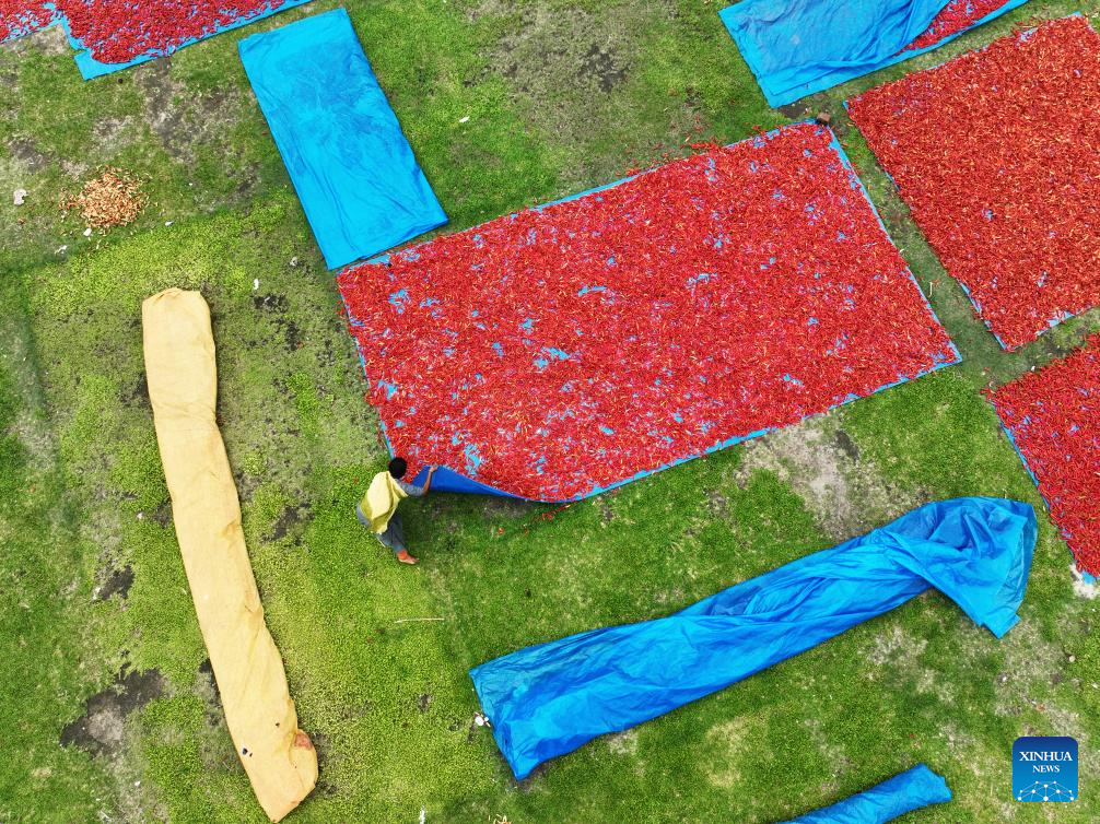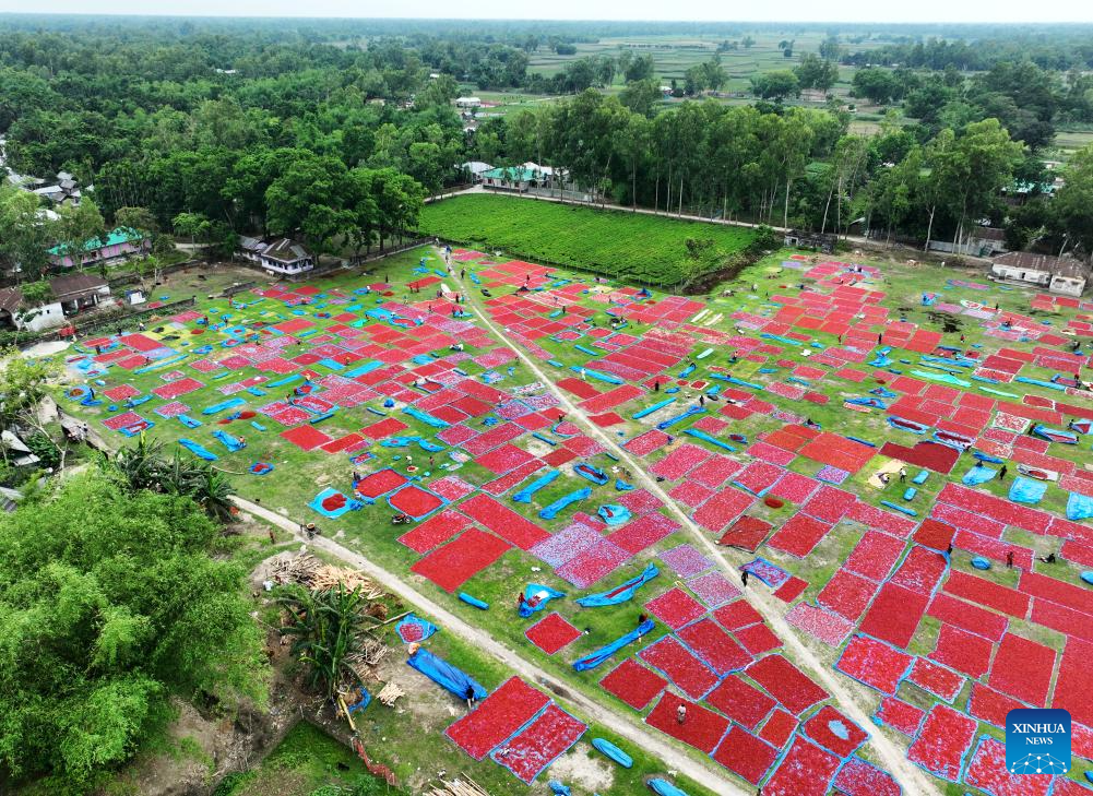 A drone photo taken on April 28, 2025 shows a local farmer drying ripe chilies in Panchagarh, Bangladesh. Located in the far north of Bangladesh, Panchagarh district's favorable cool climate and fertile soil make it suitable for chili cultivation. Lately, farmers have been busy harvesting mature chilies and laying them out on large plastic sheets to dry in the open air. (Xinhua)