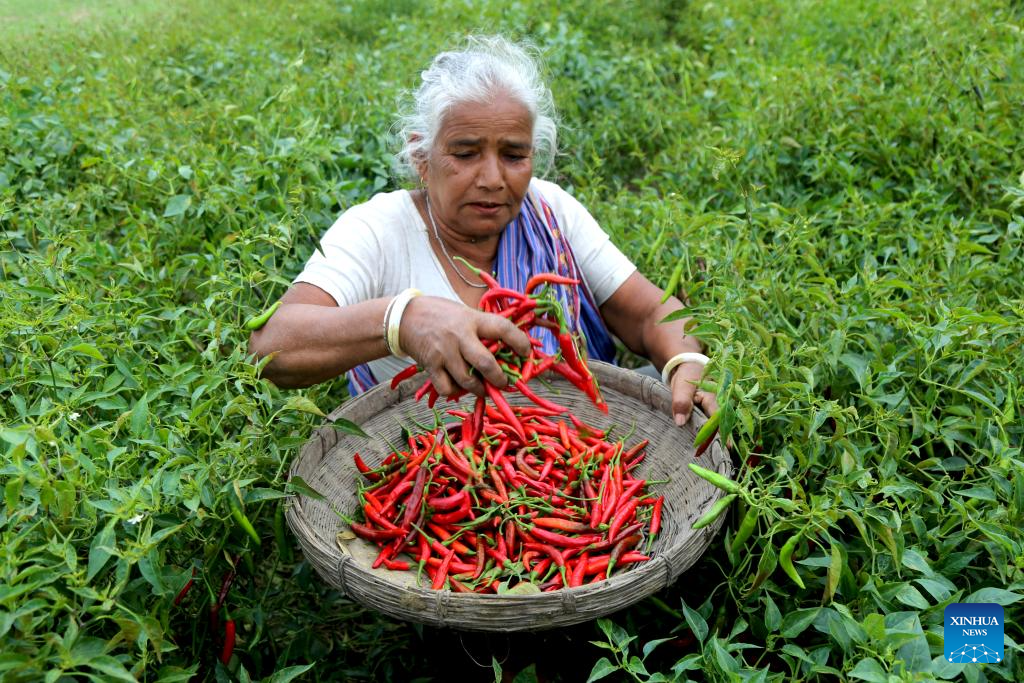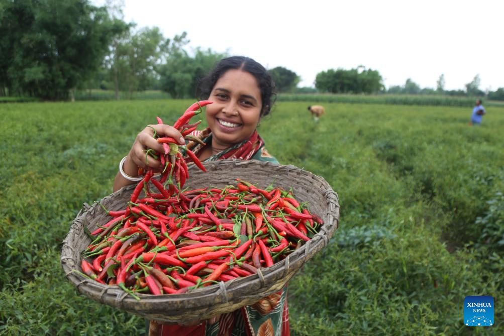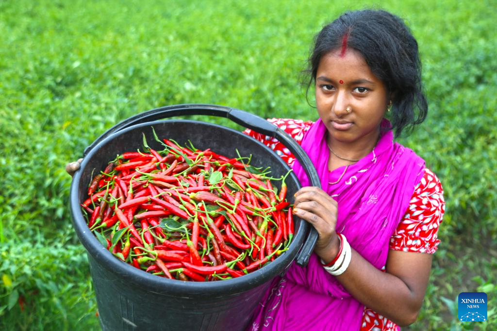 A local farmer shows ripe chilies in Panchagarh, Bangladesh, on April 28, 2025. Located in the far north of Bangladesh, Panchagarh district's favorable cool climate and fertile soil make it suitable for chili cultivation. Lately, farmers have been busy harvesting mature chilies and laying them out on large plastic sheets to dry in the open air. (Xinhua)