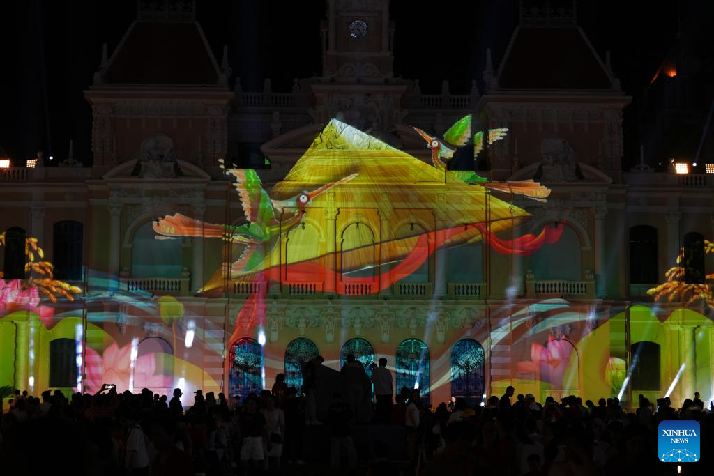 This photo taken on April 29, 2025 shows a light show taking place at the city hall in Ho Chi Minh City, Vietnam. Vietnam is in the final stage of preparations for a grand ceremony commemorating the 50th anniversary of the Liberation of the South and National Reunification, set to take place on Wednesday, local media reported. (Xinhua/Hu Jiali)