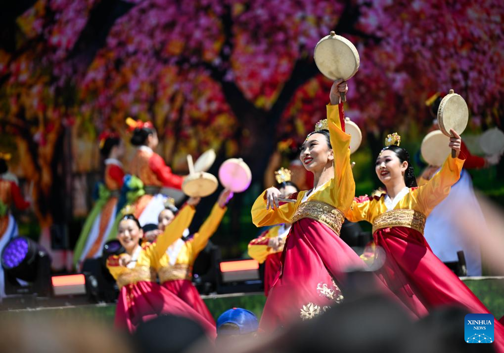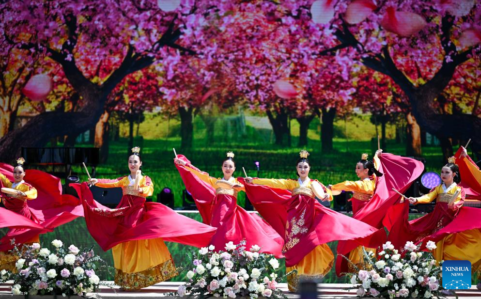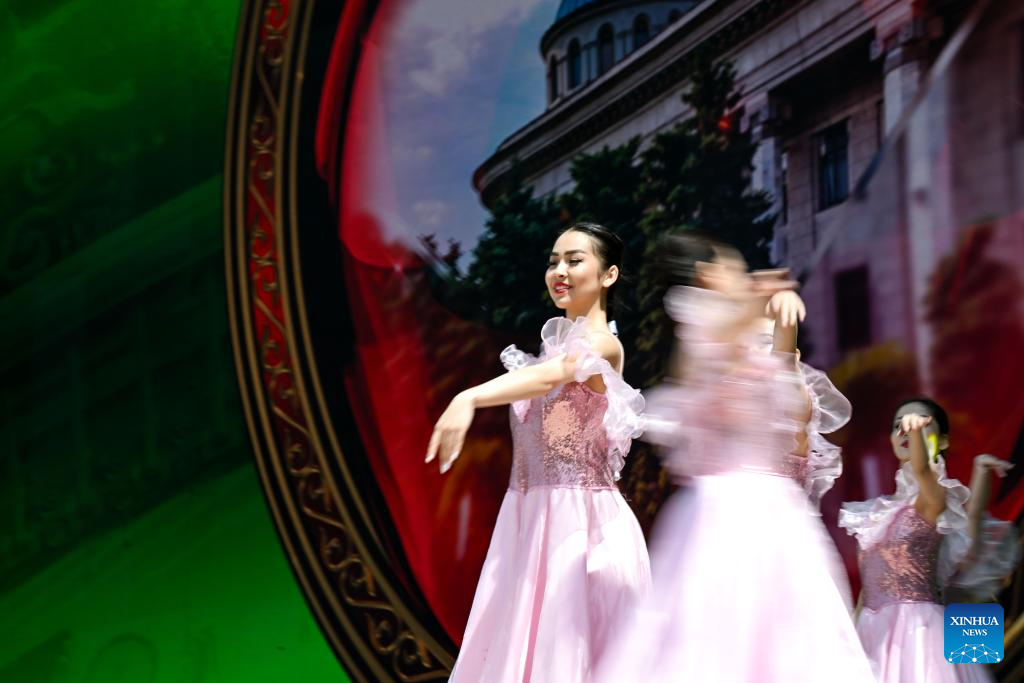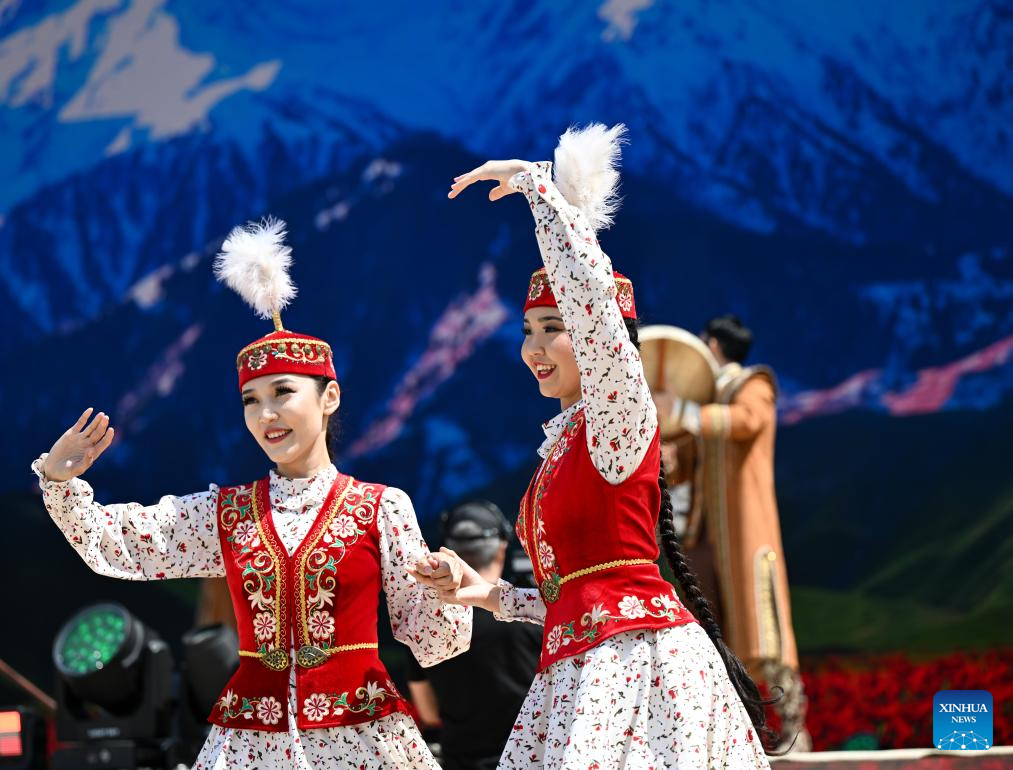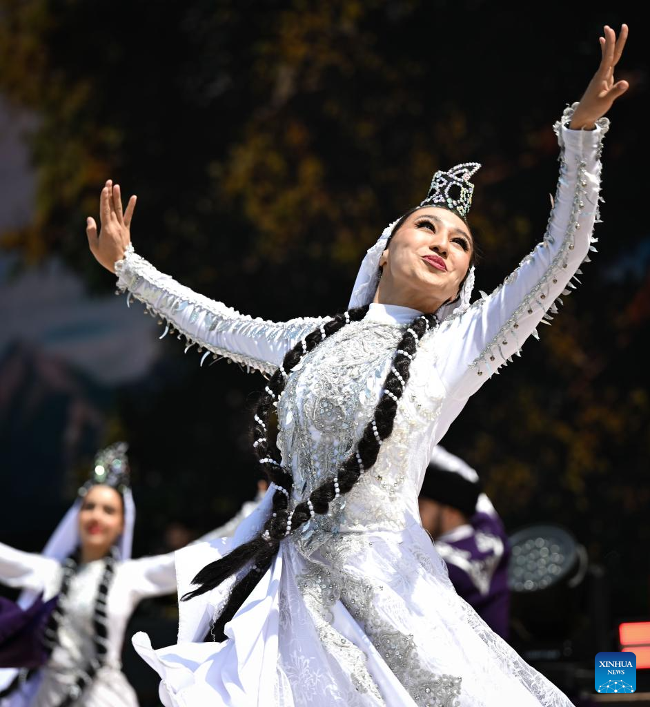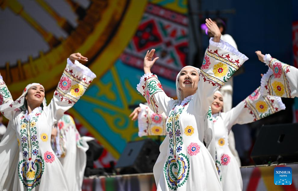 Actresses perform dance during a festival celebrating Kazakhstan's National Unity Day in Almaty, Kazakhstan, on May 1, 2025. (Xinhua/Li Renzi)