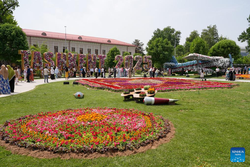 People enjoy floral displays at the square of the National Library of Uzbekistan in Tashkent, Uzbekistan, May 1, 2025.