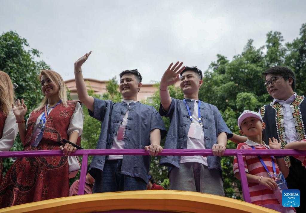 A pair of twins are pictured during the 19th Mojiang international twins festival in Mojiang Hani Autonomous County, southwest China's Yunnan province, May 1, 2025. Over 1,000 multiple births from around the world took part in a parade during the twins festival in Mojiang Hani Autonomous County on Thursday. (Xinhua/Chen Xinbo)