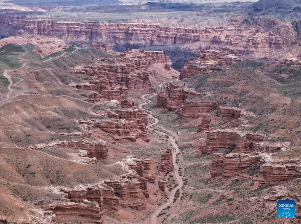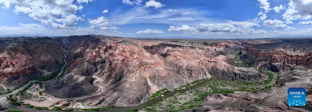 An aerial drone panorama photo taken on May 2, 2025 shows the scenary of the Charyn Canyon in Almaty Region, Kazakhstan. (Xinhua/Li Renzi)