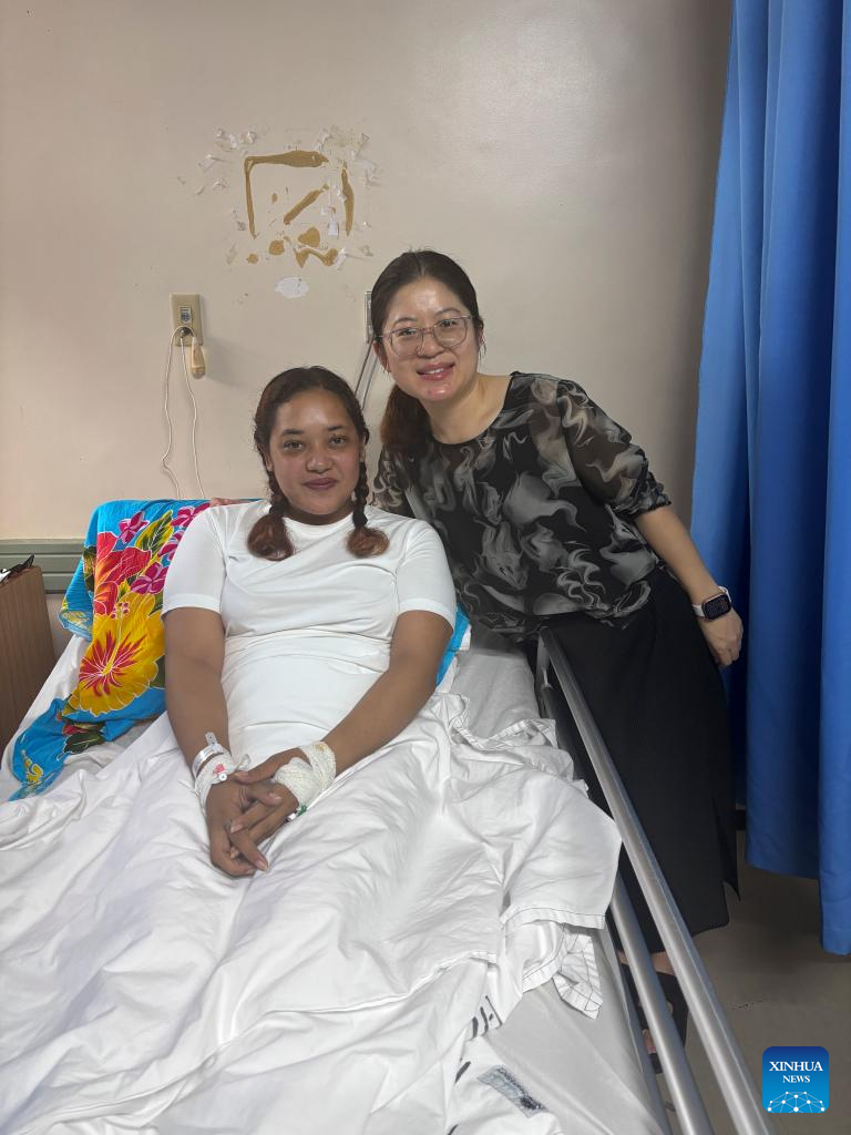 This photo taken with a mobile phone on Feb. 27, 2025 shows Chinese doctor Zhang Haifeng (R) and her patient at Vaiola Hospital in Nukualofa, Tonga.(Xinhua)