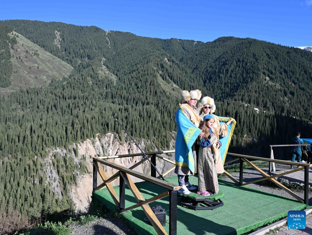Tourists pose for photos in the Kolsai Lakes National Park in Almaty Region, Kazakhstan, May 3, 2025. (Xinhua/Li Renzi)