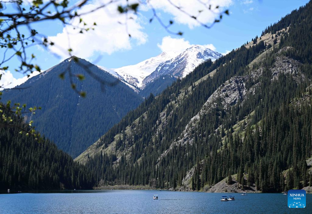 Tourists ride boats in the Kolsai Lakes National Park in Almaty Region, Kazakhstan, May 3, 2025. (Xinhua/Li Renzi)