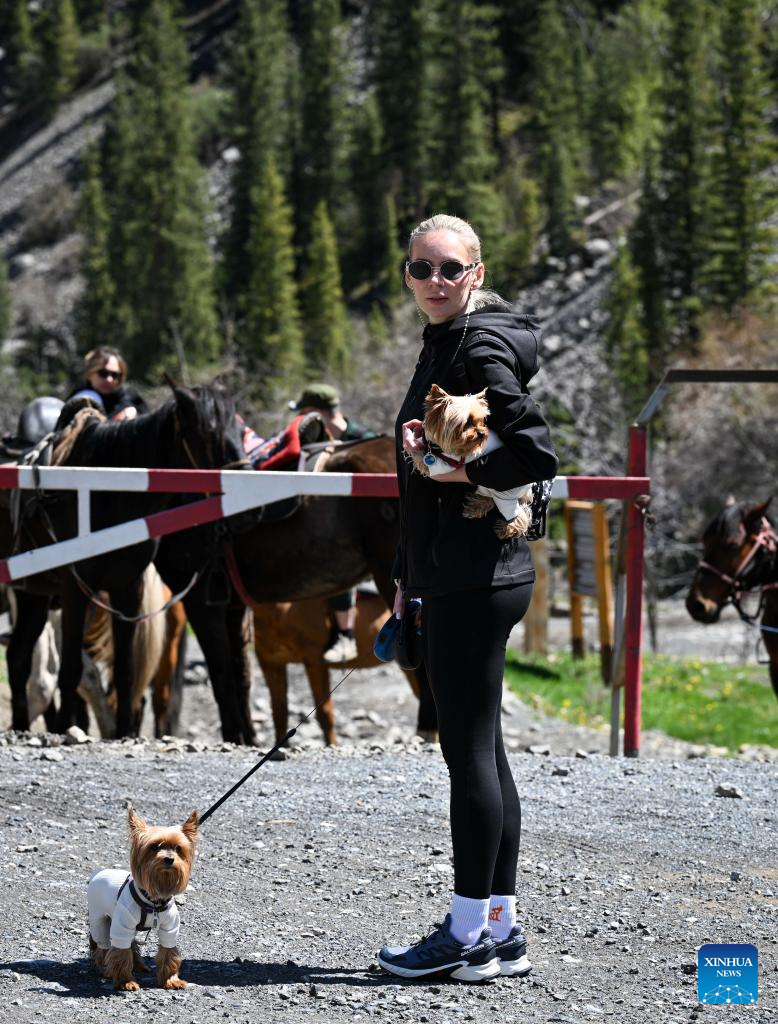 A tourist with pet dogs visits the Kolsai Lakes National Park in Almaty Region, Kazakhstan, May 3, 2025. (Xinhua/Li Renzi)