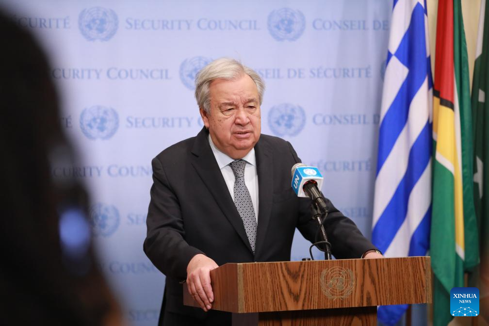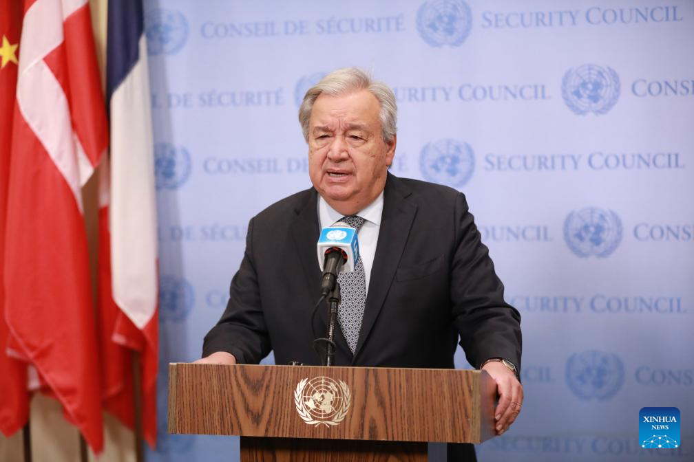 UN Secretary-General Antonio Guterres speaks to the press outside the Security Council Chamber at the UN headquarters in New York, on May 5, 2025. "Make no mistake: A military solution is no solution," Guterres said on the tensions between India and Pakistan, at the press encounter on Monday. (Xinhua/Xie E)