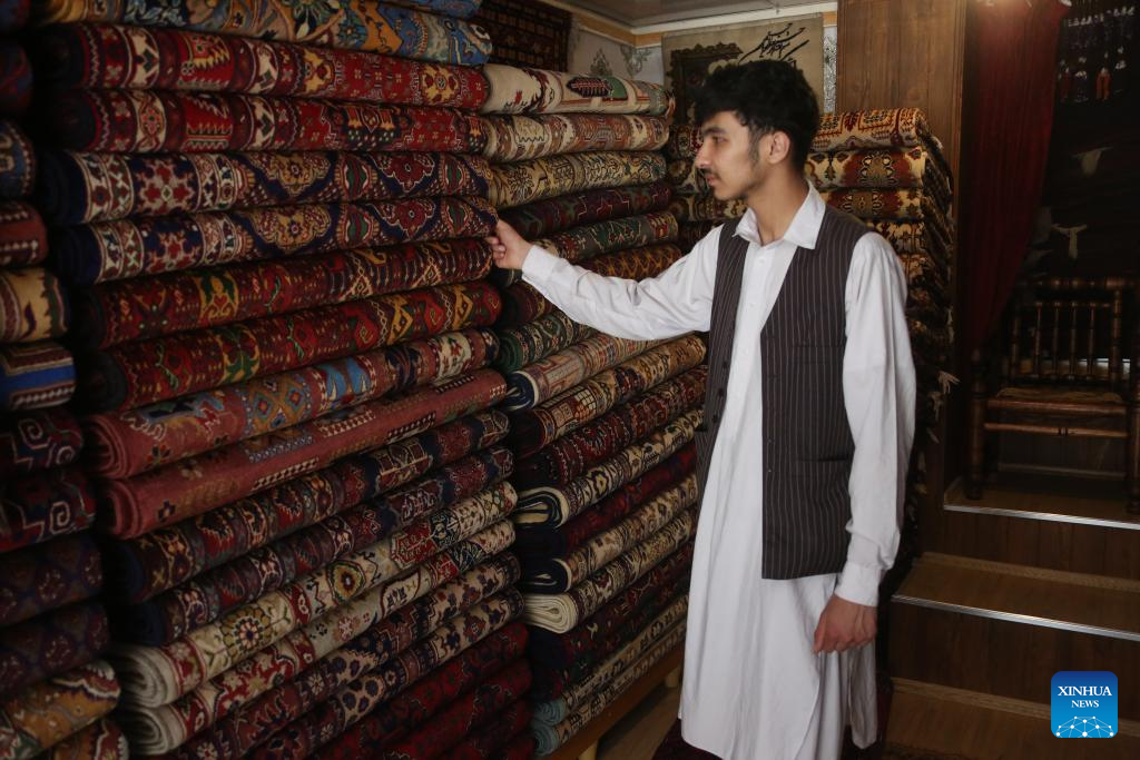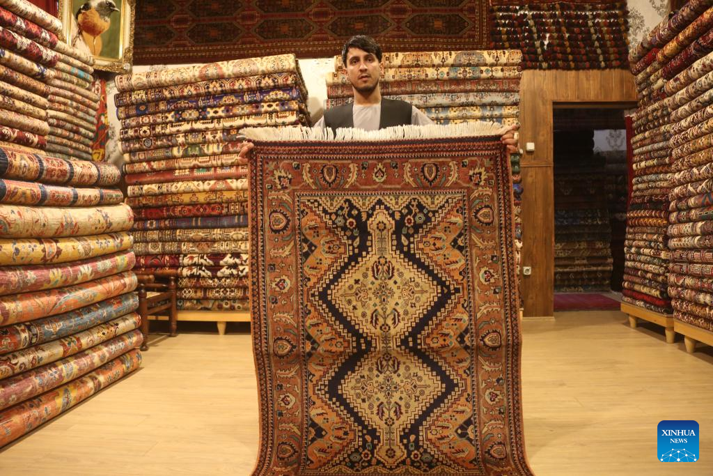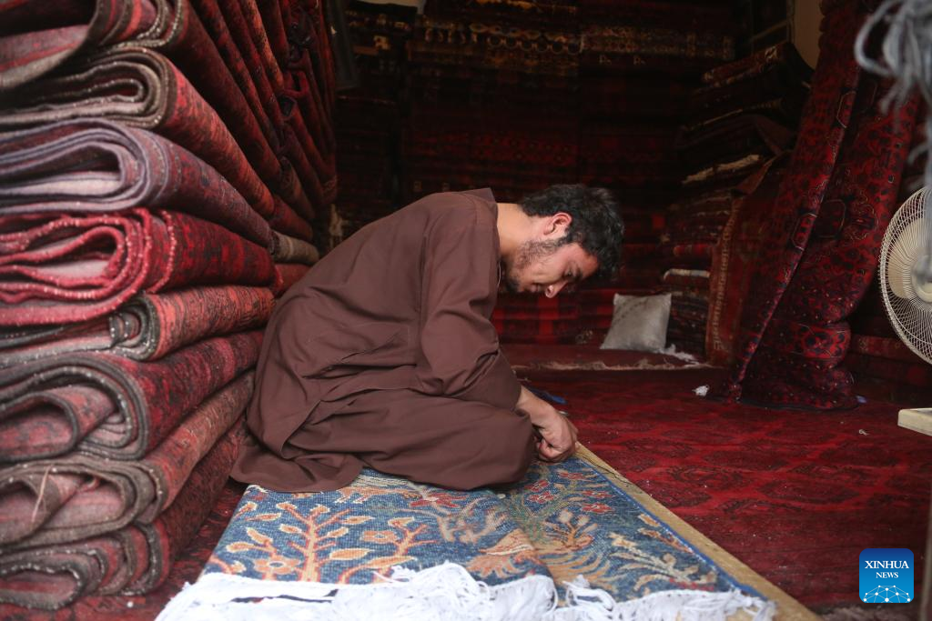 A vendor checks carpets at a store in Kabul, Afghanistan, May 7, 2025. Afghanistan has exported carpets worth more than 15 million U.S. dollars over the past year, spokesman for the Ministry of Industry and Commerce, Akhundzada Abdul Salam Jawad, said. (Photo by Saifurahman Safi/Xinhua)