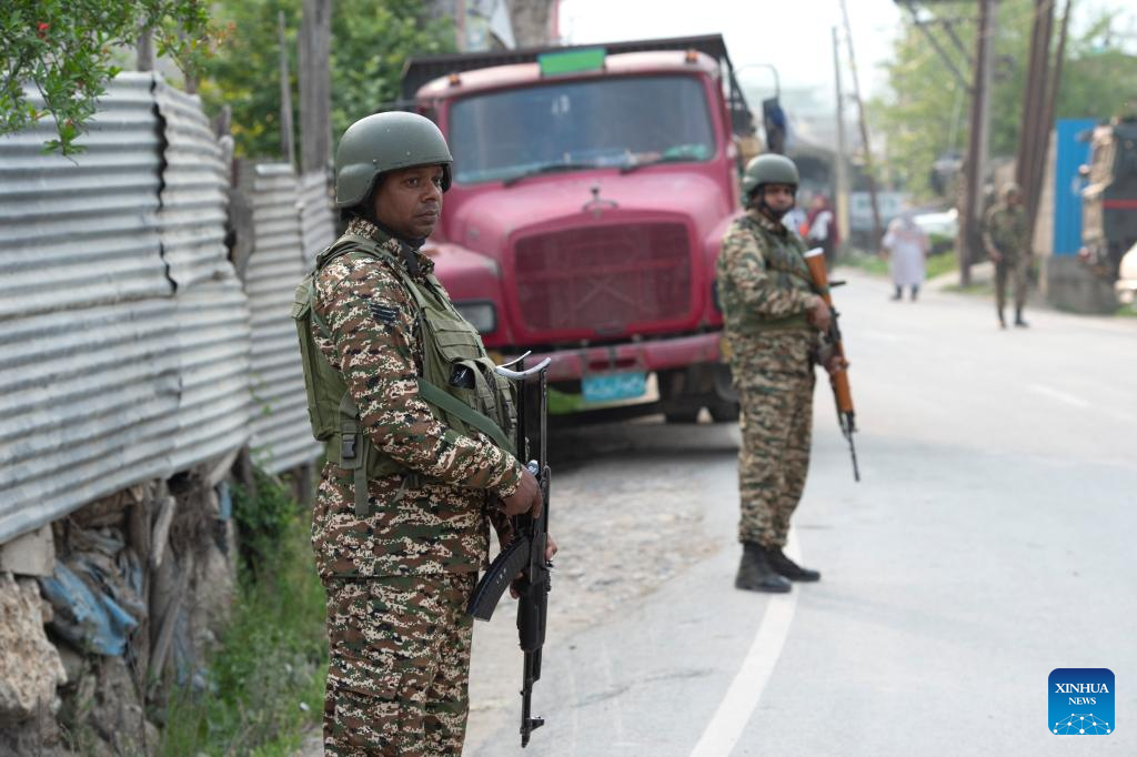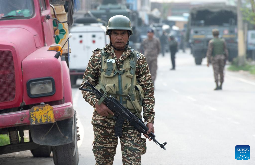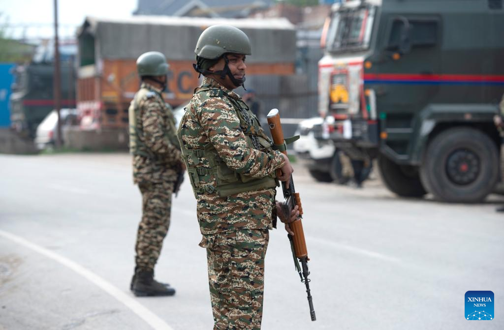 Indian paramilitary troopers stand guard near a checkpoint on the outskirts of Srinagar city, the summer capital of Indian-controlled Kashmir, May 7, 2025. (Xinhua/Javed Dar)