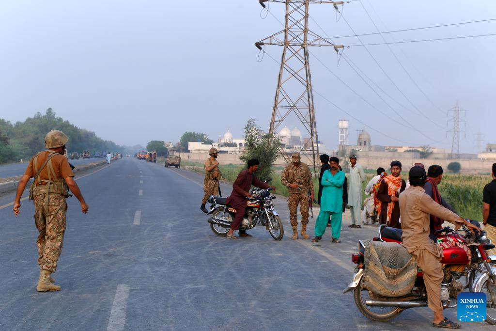 Pakistani soldiers cordon off a road following Indian missile strikes in Bahawalpur district, Punjab province, eastern Pakistan on May 7, 2025. At least 26 people were killed and 46 others injured after India carried out strikes on six civilian settlements in Pakistan, Ahmed Sharif Chaudhry, director general of the Inter-Services Public Relations, the media wing of the Pakistani army, confirmed during a press briefing on Wednesday. (Photo by Mansoor Abbas/Xinhua)