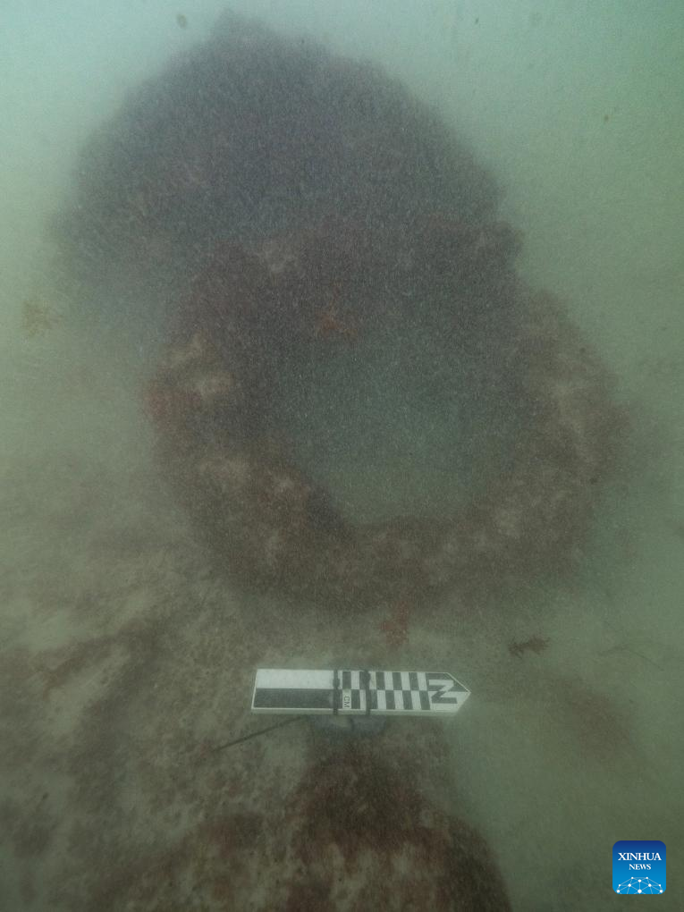 This photo taken on March 12, 2025 shows part of the windlass protruding from the seabed. Researchers have located the shipwreck of Koning Willem de Tweede, a 19th-century Dutch merchant vessel lost in 1857 off the coast of South Australia, the Australian National Maritime Museum has revealed. (Xinhua)