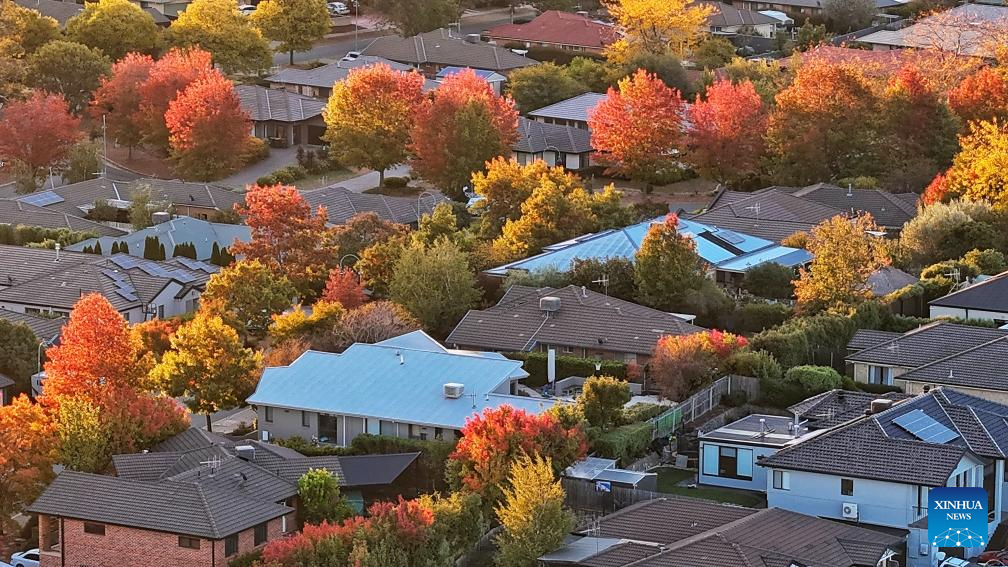 An aerial drone photo taken on April 12, 2025 shows an autumn view of a residential area in Canberra, Australia. (Photo by Xu Xiuzhen/Xinhua)
