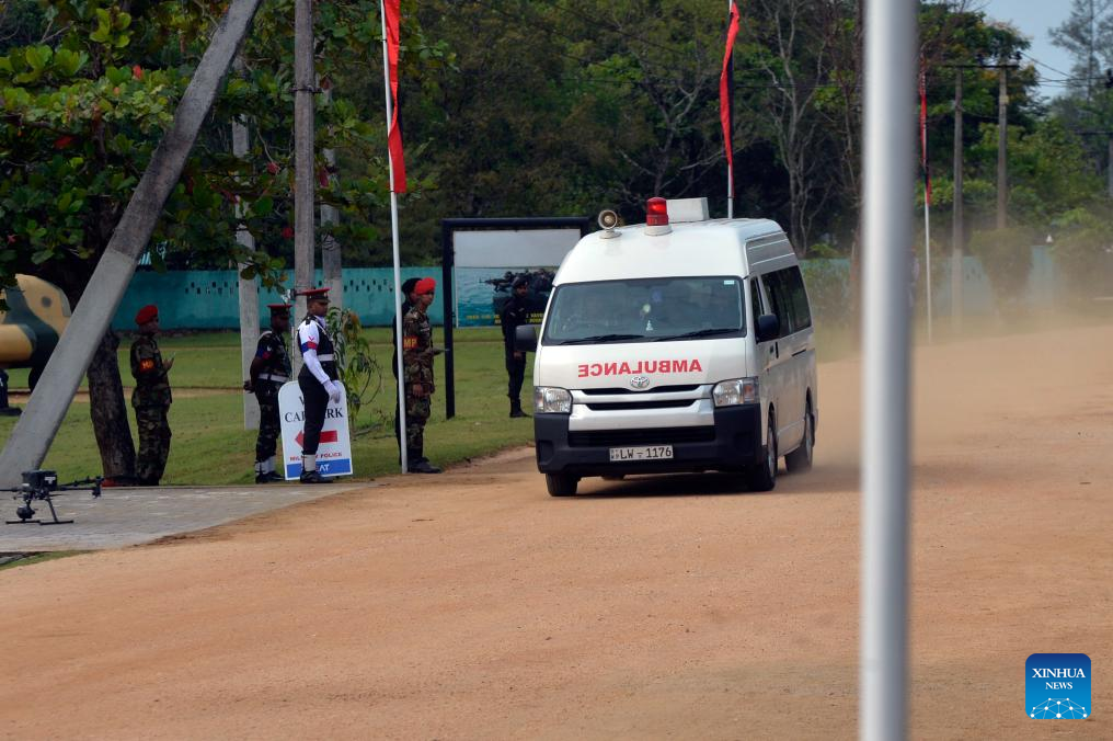 An ambulance carrying injured people runs to a hospital after a helicopter crash near Polonnaruwa, Sri Lanka, April 9, 2025. Six military personnel succumbed to their injuries after a Sri Lankan Air Force helicopter crashed into the Maduru Oya Reservoir in the country's North Central Province on Friday morning, said a spokesperson. (Photo by Gayan Sameera/Xinhua)