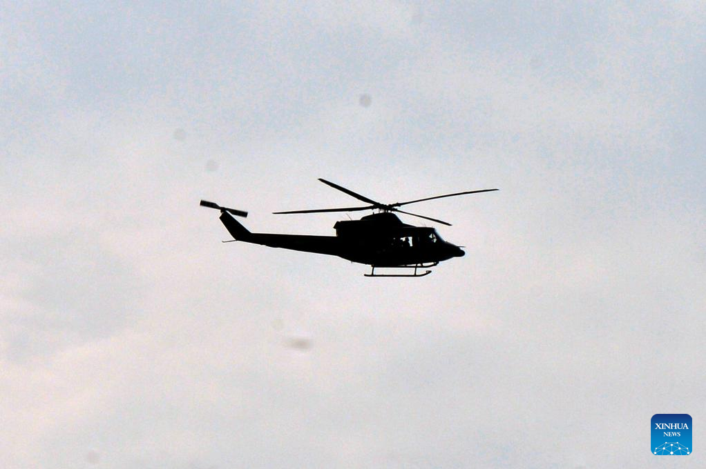 A helicopter flies to Polonnaruwa to take part in rescue operations after a helicopter crash in Sri Lanka, April 9, 2025. Six military personnel succumbed to their injuries after a Sri Lankan Air Force helicopter crashed into the Maduru Oya Reservoir in the country's North Central Province on Friday morning, said a spokesperson. (Photo by Gayan Sameera/Xinhua)