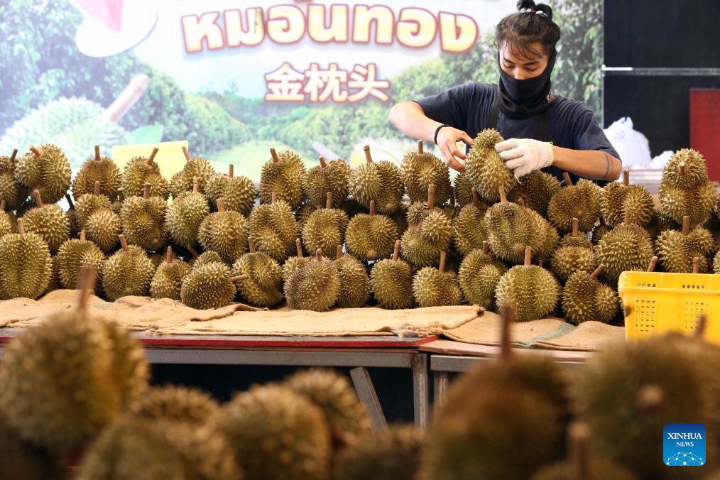 A vendor selects durians for customers at a market in Bangkok, Thailand, May 9, 2025. The time period from April to May is the peak harvest season of durian in eastern Thailand. (Xinhua/Rachen Sageamsak)