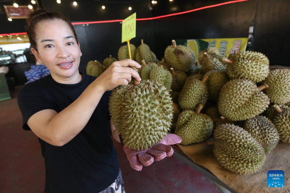A vendor shows a durian at a market in Bangkok, Thailand, May 9, 2025. The time period from April to May is the peak harvest season of durian in eastern Thailand. (Xinhua/Rachen Sageamsak)
