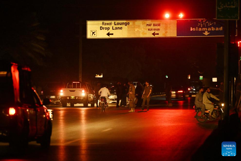 Policemen stop vehicles near Nur Khan Air Base following an Indian attack in Rawalpindi, Pakistan, May 10, 2025. India launched air-to-surface missiles at three air bases in Pakistan, but all strategic assets of the Pakistan Air Force remained safe in the attack, a spokesperson for the Pakistani army said in the wee hours of Saturday. (Xinhua/Ahmad Kamal)