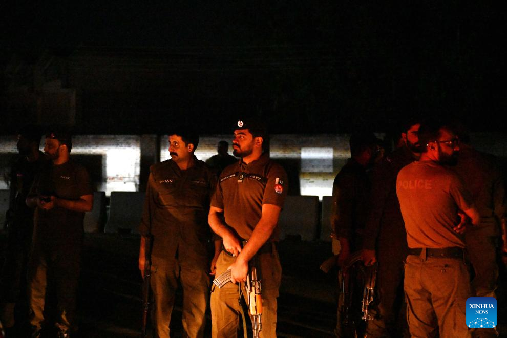 Policemen stand guard on a road near Nur Khan Air Base following an Indian attack in Rawalpindi, Pakistan, May 10, 2025. India launched air-to-surface missiles at three air bases in Pakistan, but all strategic assets of the Pakistan Air Force remained safe in the attack, a spokesperson for the Pakistani army said in the wee hours of Saturday. (Xinhua/Ahmad Kamal)