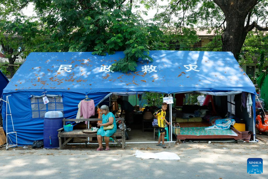 Earthquake-affected people are pictured at a tent donated by China in Mandalay, Myanmar, May 9, 2025. (Xinhua/Myo Kyaw Soe)