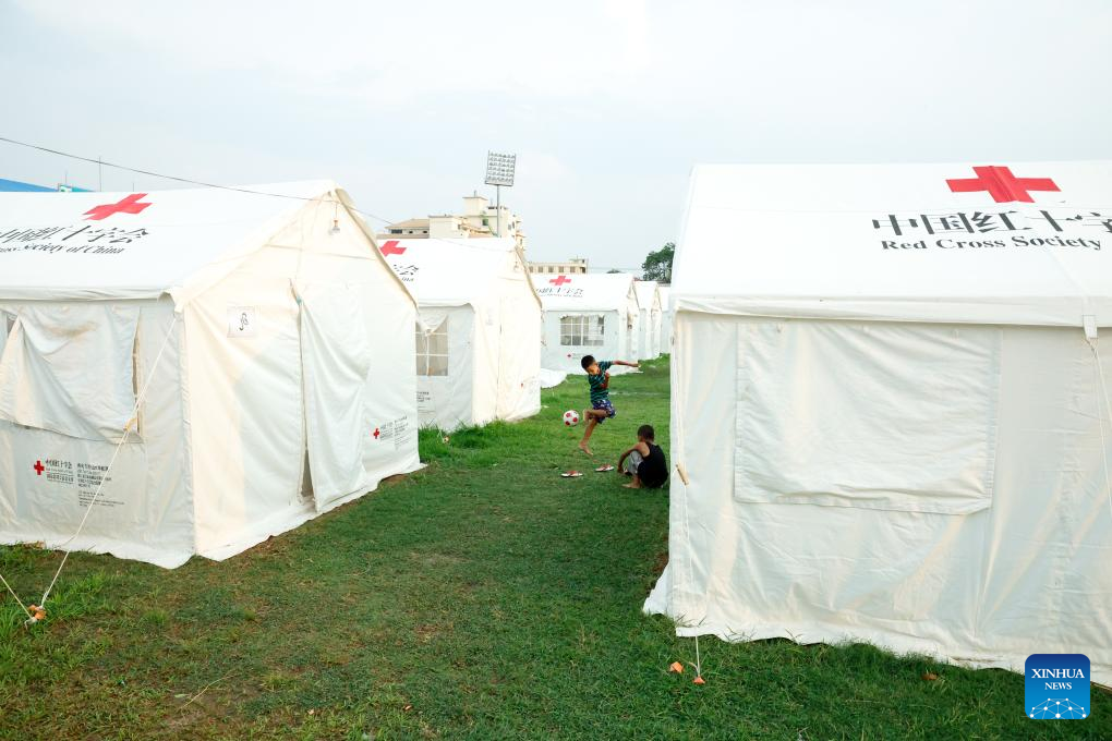 This photo taken on May 10, 2025 shows China-donated tents in a relief shelter in Mandalay, Myanmar. (Xinhua/Myo Kyaw Soe)