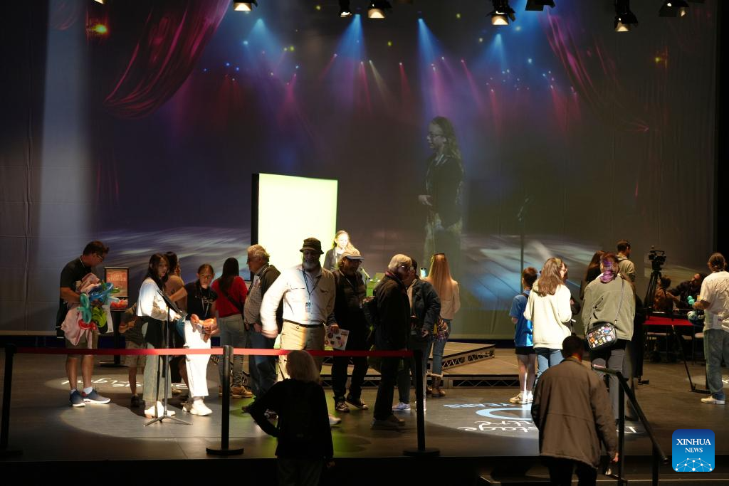 Visitors interact on stage, experiencing theatrical lighting effects from a performer's perspective, during an open day event of the Canberra Theater Center in Canberra, Australia, on May 10, 2025. The Canberra Theater Center opened its doors to the public on Saturday as part of its 60th anniversary celebrations. (Photo by Zhang Na/Xinhua)