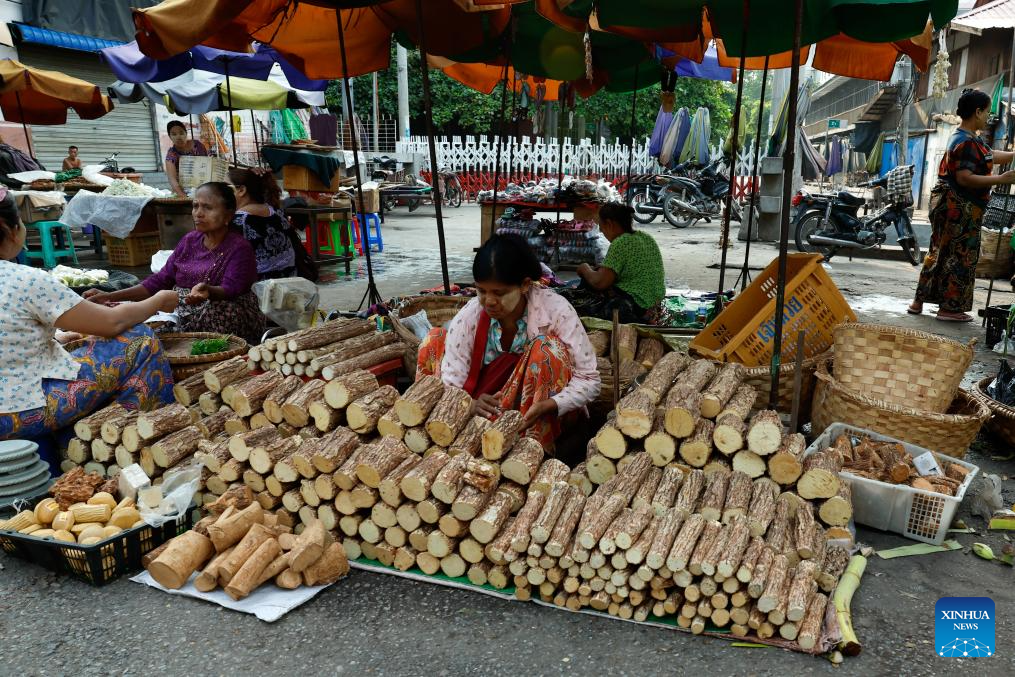 A vendor sells Thanaka bark at a local market in Mandalay, Myanmar, May 11, 2025. (Xinhua/Myo Kyaw Soe)