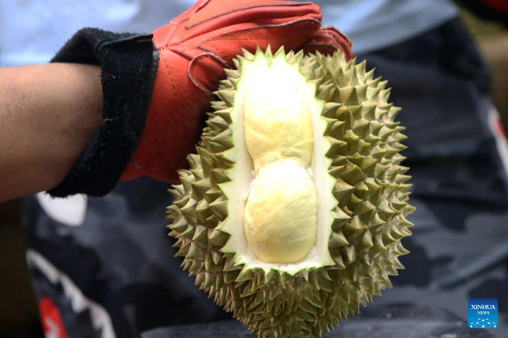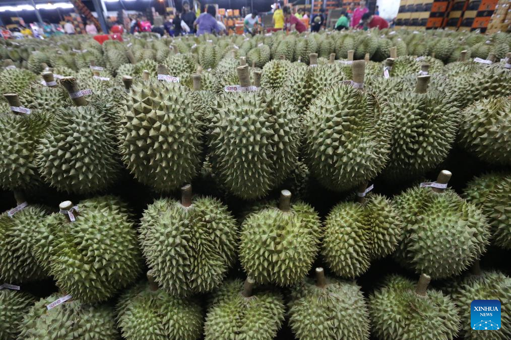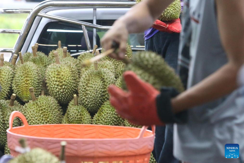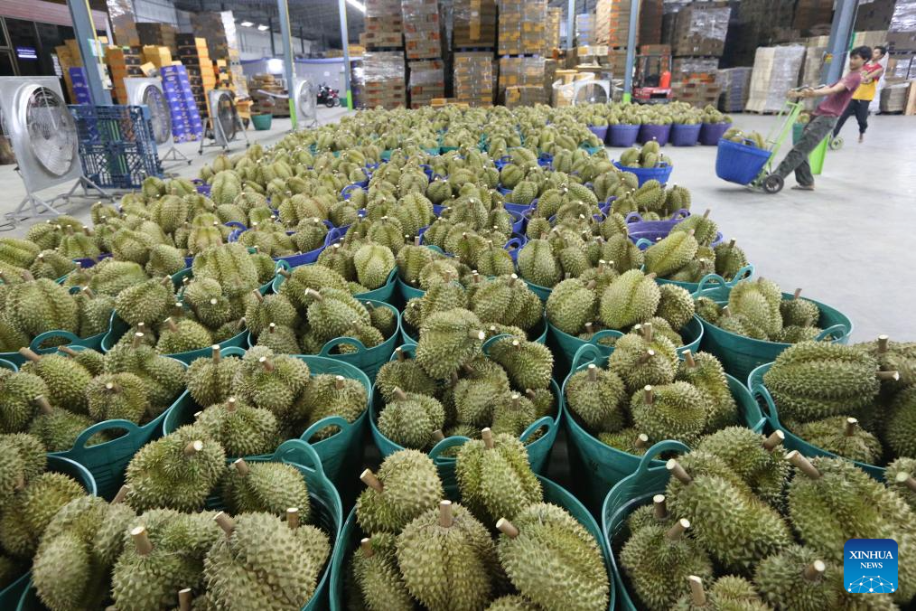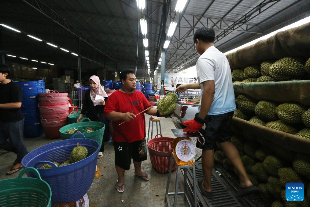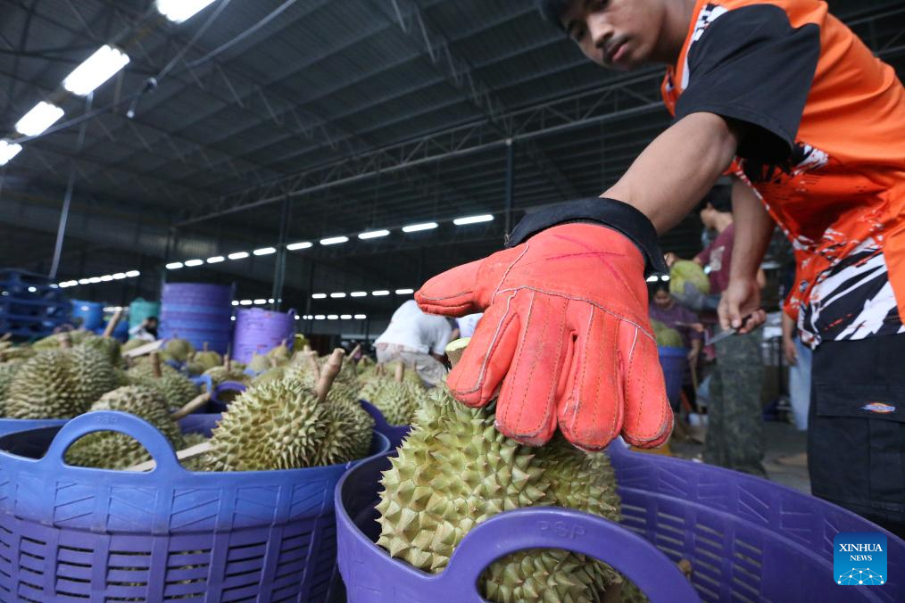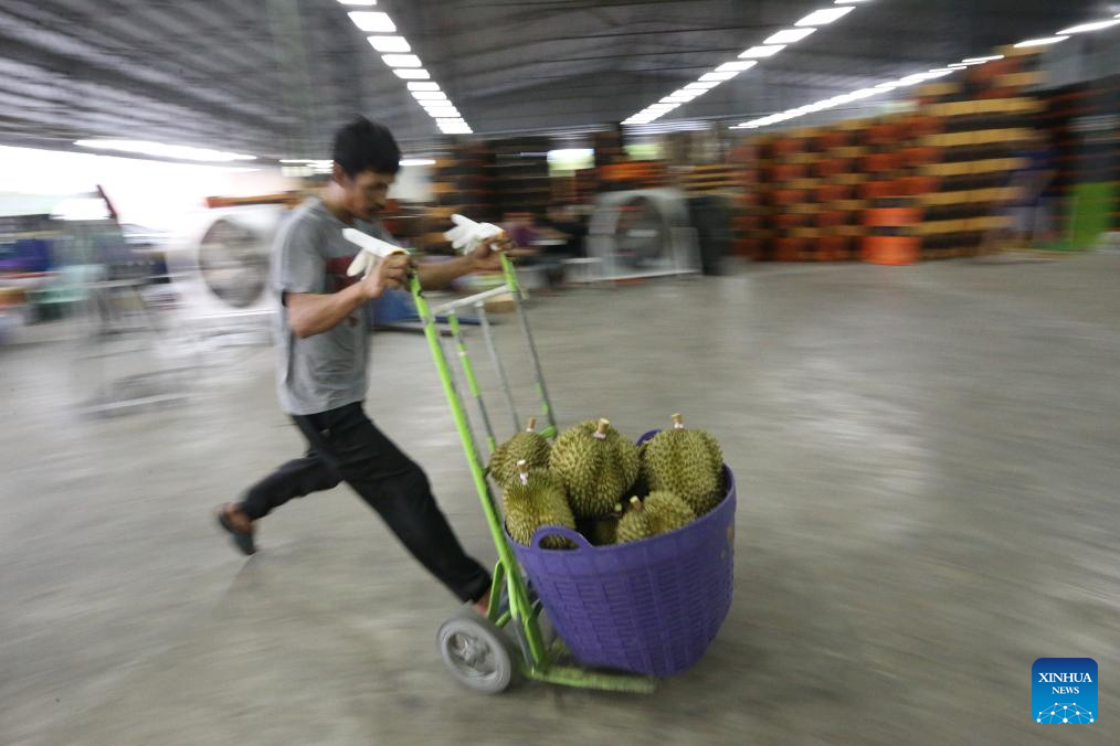 Durians in east Thailand greet its harvest peak in April and May. "Long" is one of the biggest durian processing and distribution centers in Thailand. It is where durians from various farms are collected, sorted, graded, and packed for export. (Xinhua/Rachen Sageamsak)
