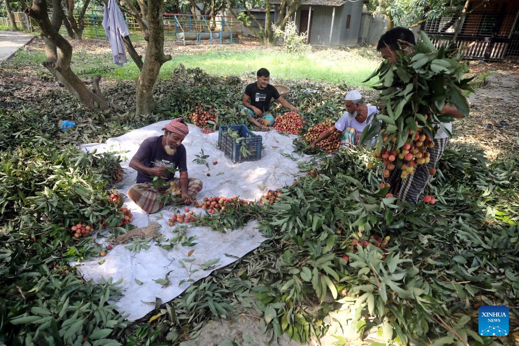 Farmers sort bundles of ripe lychees at a lychee garden in Narayanganj, Bangladesh on May 14, 2025. (Photo by Habibur Rahman/Xinhua)