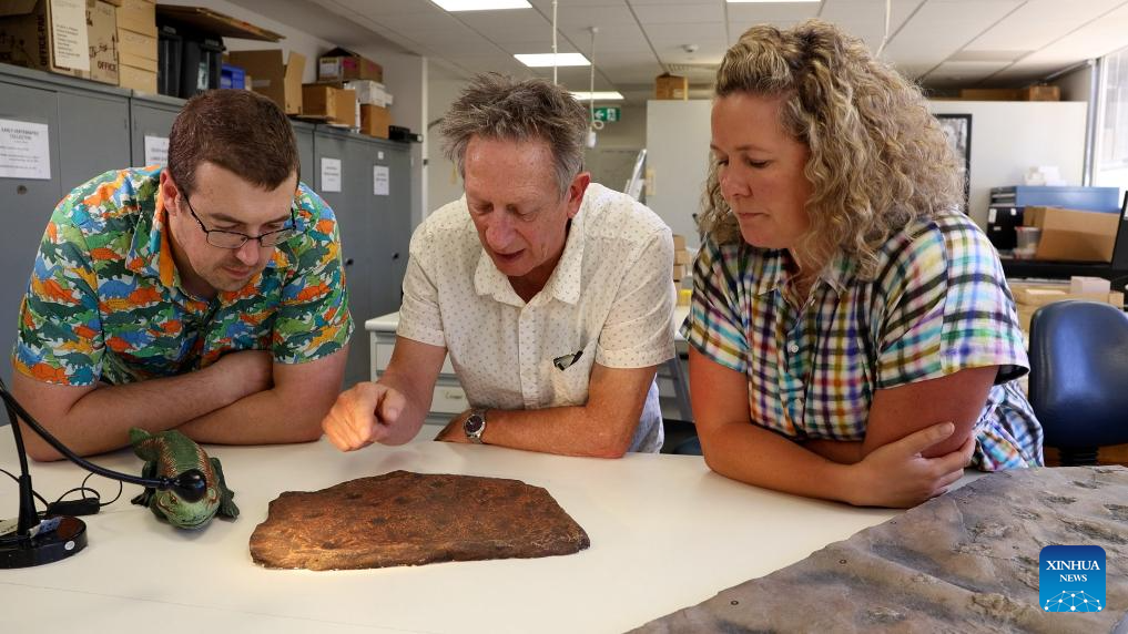 This image provided by Flinders University on April 29, 2025 shows palaeontologist professor John Long (C) and two fellow researchers analyzing a replica of fossilized footprints. Fossilized footprints discovered in Australia's Victoria have revealed that reptiles may have walked the Earth up to 40 million years earlier than previously thought, Flinders University said on Thursday.(Flinders University/Handout via Xinhua)