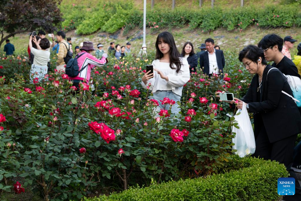 People enjoy flowers at Seoul Rose Festival in Seoul, South Korea, May 18, 2025. The festival runs from May 16 to 24. (Photo by Jun Hyosang/Xinhua)