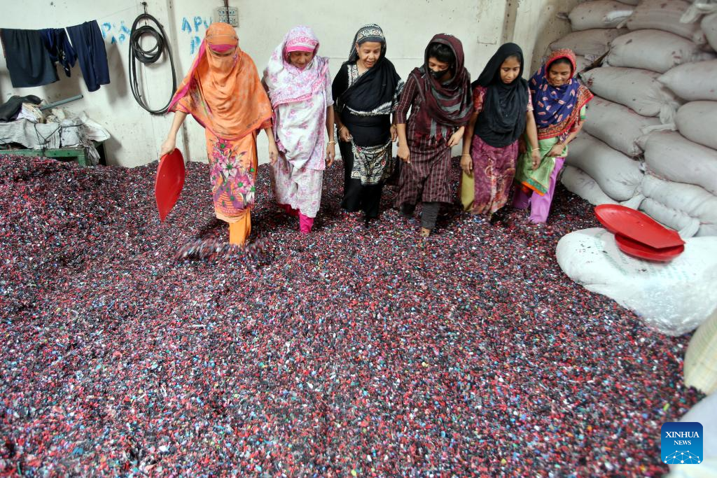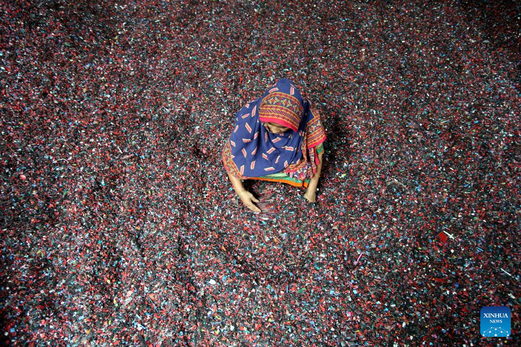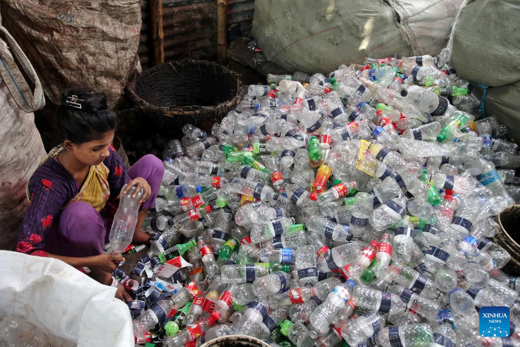 Waste collectors sort recyclable plastic products in Dhaka, Bangladesh on May 7, 2025. (Photo by Habibur Rahman/Xinhua)