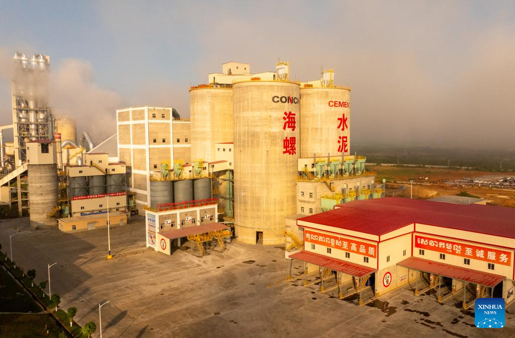 An aerial drone photo taken on May 20, 2025 shows a cement production plant in Kampong Speu province, Cambodia. The 250-million-U.S.-dollar cement production plant, jointly invested by Chinese and Cambodian investors, was put into operation here in western Cambodia on Tuesday. (Photo by Nitola/Xinhua)