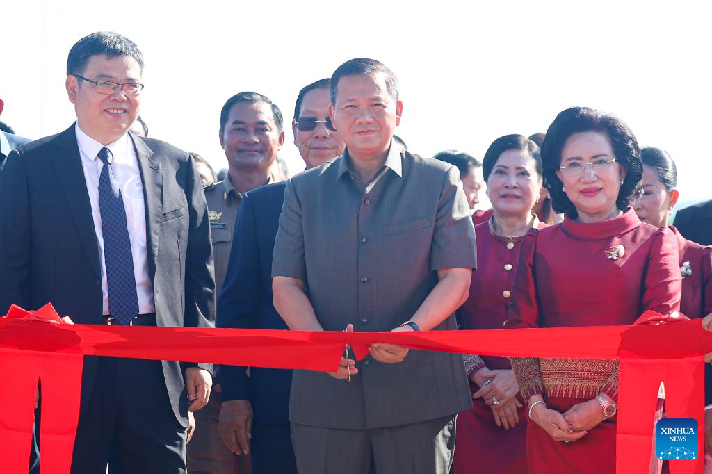 Cambodian Prime Minister Hun Manet (C, front) cuts the ribbon to inaugurate a cement production plant in Kampong Speu province, Cambodia on May 20, 2025. The 250-million-U.S.-dollar cement production plant, jointly invested by Chinese and Cambodian investors, was put into operation here in western Cambodia on Tuesday. (Photo by Nitola/Xinhua)