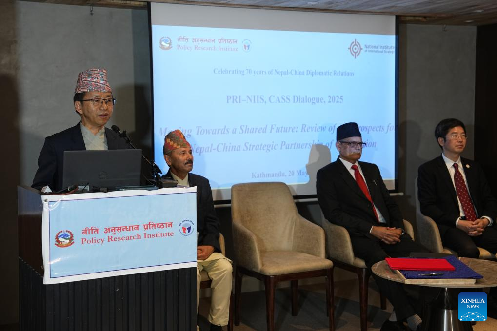 Nepal's Policy Research Institute and the National Institute of International Strategy under the Chinese Academy of Social Sciences sign a memorandum of understanding for cooperation in Kathmandu, Nepal, May 20, 2025. Strategic professionals and scholars from top think tanks of Nepal and China met in the Nepali capital on Tuesday and deliberated on the prospects for bilateral strategic partnership of cooperation on the occasion of the 70th anniversary of diplomatic ties. Government officials and experts from the two countries also attended the seminar organized jointly by Nepal's Policy Research Institute and the National Institute of International Strategy under the Chinese Academy of Social Sciences. (Xinhua/Yi Aijun)